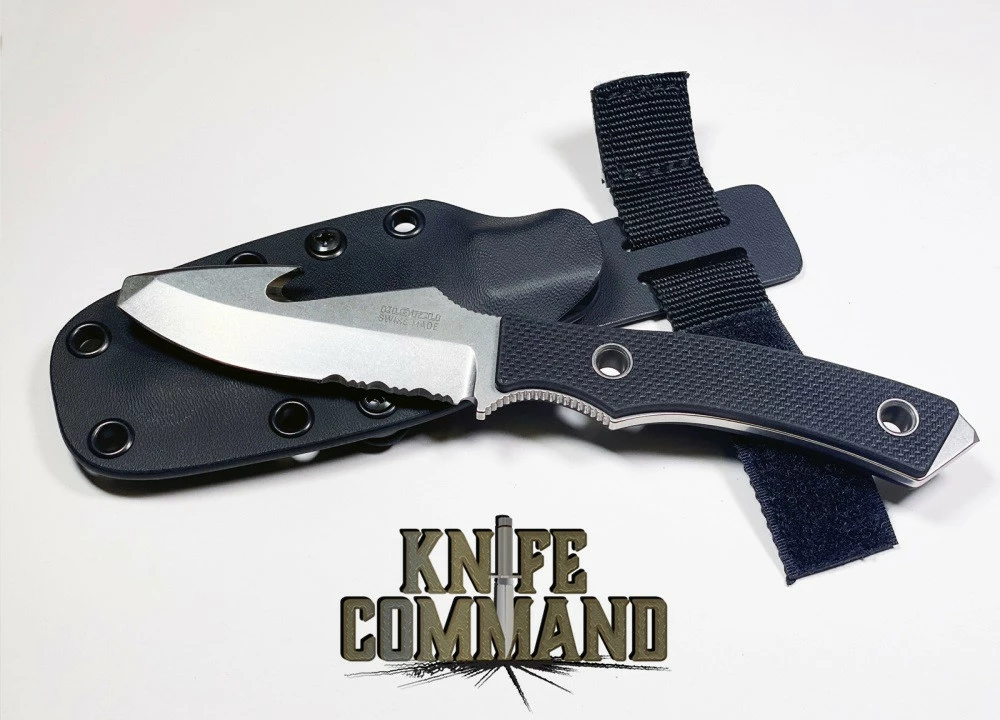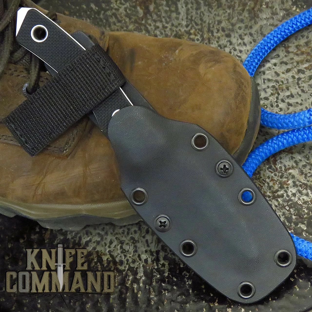 This full tang knife is 7-1/2″ long with a 3″ blade. It is hand ground of Bohler N690 stainless steel. The knife is 1/8″ thick and weighs 2.25 ounces. There are ribs on top and a finger groove handle for a secure grip. This knife features a squared off blunt tip for chisling/flat blade screwdriver, a partially serrated cutting edge, a belt/line cutter, and a glass breaker pommel. The knife has a Stonewash finish and comes with textured black micarta handle scales. For carrying, a black kydex sheath is provided. It can be conveniently carried as a neck knife, boot knife, or on a belt or pack when used with an adapter.