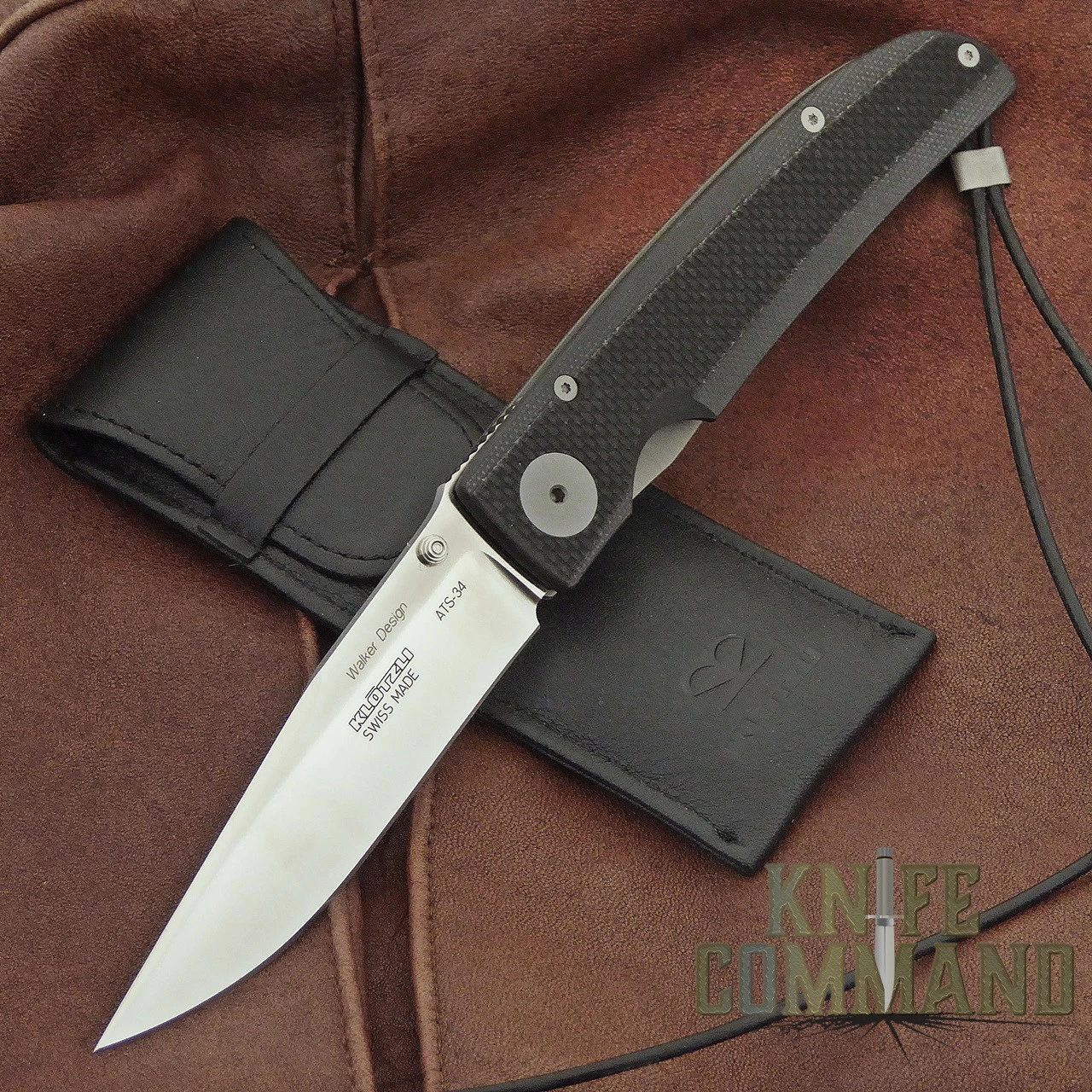 The Walker 03 Tactical features milled Black G-10 scales and a Titanium Walker liner lock. The 3-1/2″ clip point ATS-34 stainless steel blade has a fine cutting edge. There is a thumb stud for one hand opening. The G-10 handle is 4-1/2″ long and has an open back column design with a classic split-tail leather lanyard. The milled G-10 scales have a coarse texture strip down the middle for a very sure grip. A stainless steel Klotzli pocket clip keeps your knife at the ready. Weighing only 2.5 ounces, this 8″ open length folder is almost weightless cutting power. The Walker 03 Tactical comes brand new in the original Klotzli box with all papers and a black leather pocket pouch.