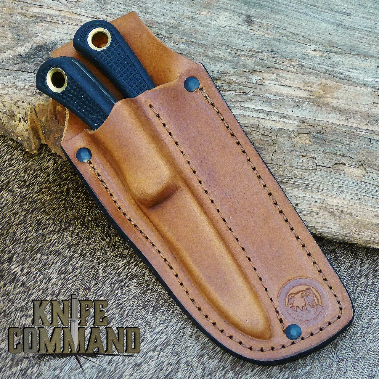 The Caribou Combo consists of two knives in one combination sheath. The Light Hunter Cleaver is a full tang knife that is 7-1/2″ in overall length. The blade is .1″ thick D2 steel and has a long, 4-1/4″ cutting edge. The back of the blade has thumb notches and a large capacity gut hook. This combo also included is the Cub Bear. This is a great knife for fine detail work. It is another full tang knife of D2 steel that is approximately 3/32″ thick. Dual finger choils a fine point, and a razor sharp cutting edge come in very handy. Both knives have black SureGrip handles with large lined lanyard holes. Both knives fit in their custom, dual knife leather sheath.