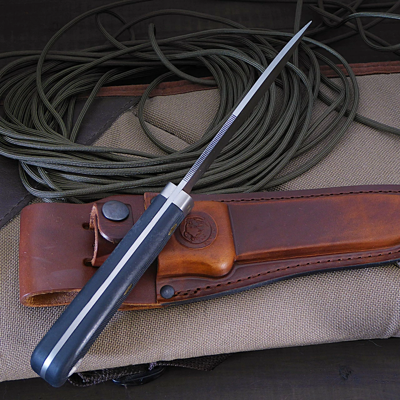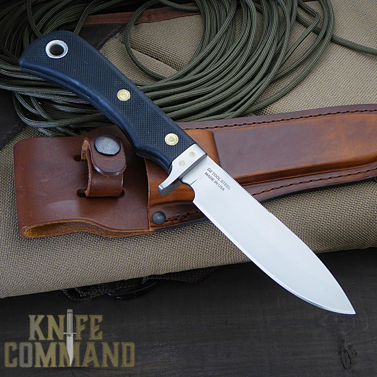 The 9-1/2″ overall length is not too big, not too small. The Drop-point, D2 steel blade is 4-3/4″ from tip to guard. It features a non-glare, ceramic peened finish and is hardened to HRC 59-61. This sturdy full tang knife has black SureGrip handles, a solid stainless steel guard, and a large lined lanyard hole. Carry is easy and stylish with the included vegetable tanned, oiled split-grained cowhide sheath.