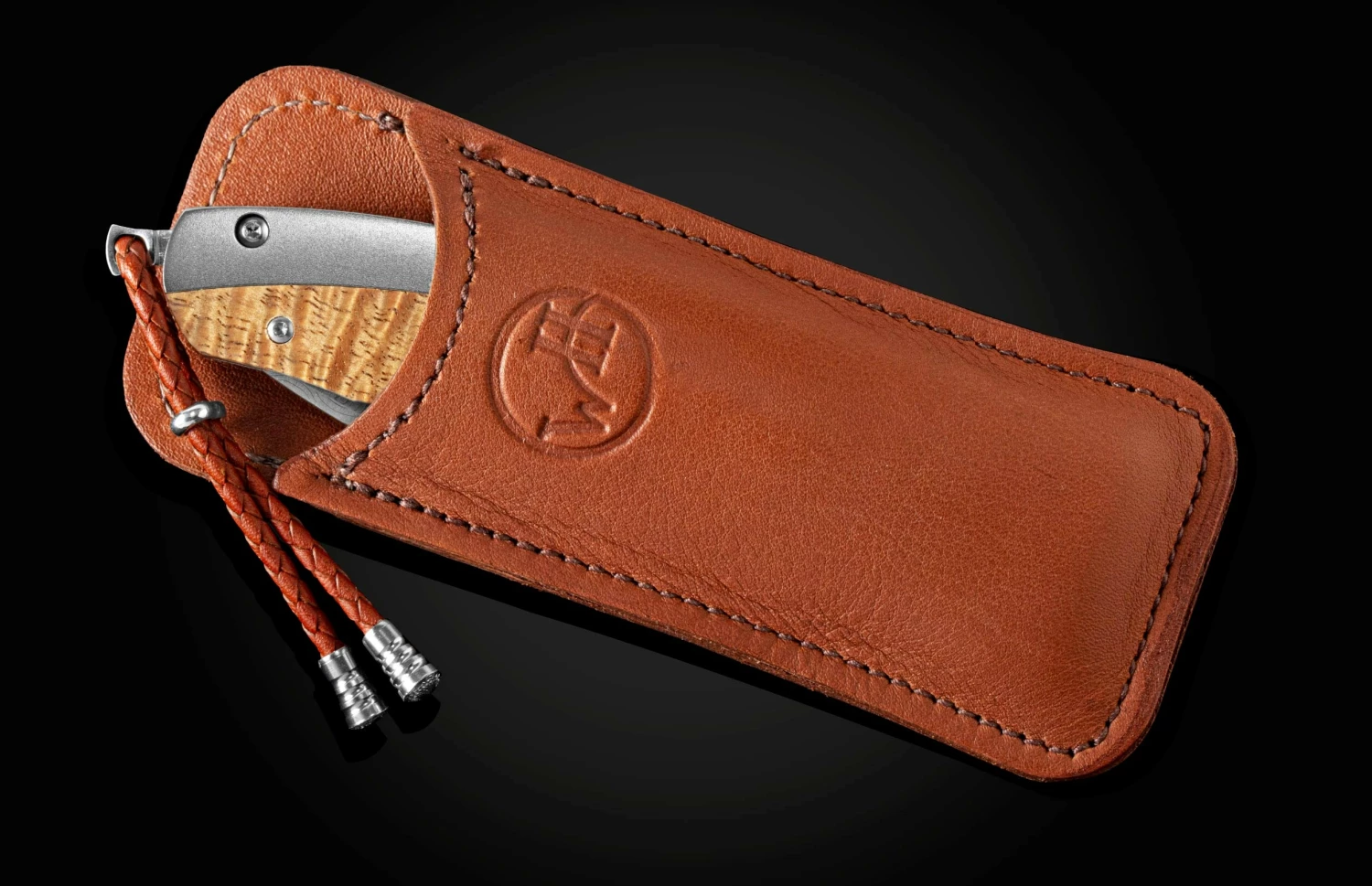 The C15 ‘Kona’ features premium Curly Koa wood from the namesake Hawaiian islands, set into a lightweight yet durable titanium frame. The blade is hand-forged ‘Ripple’ damascus steel by Chad Nichols. Fittings are tempered stainless, titanium, sterling silver and inlaid smoky quartz in 18K bezels.