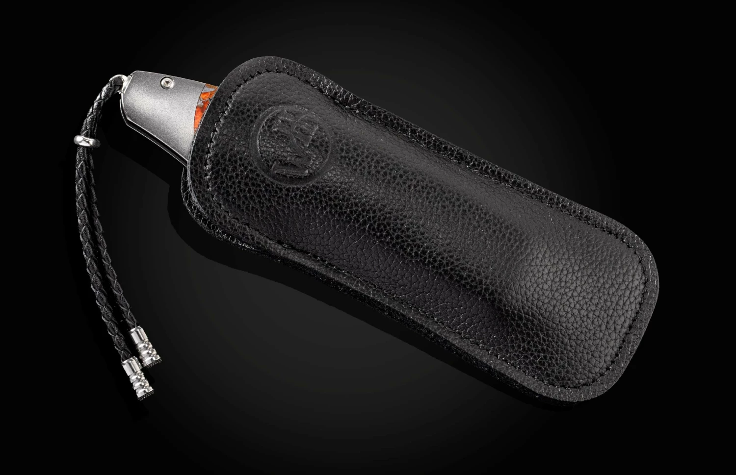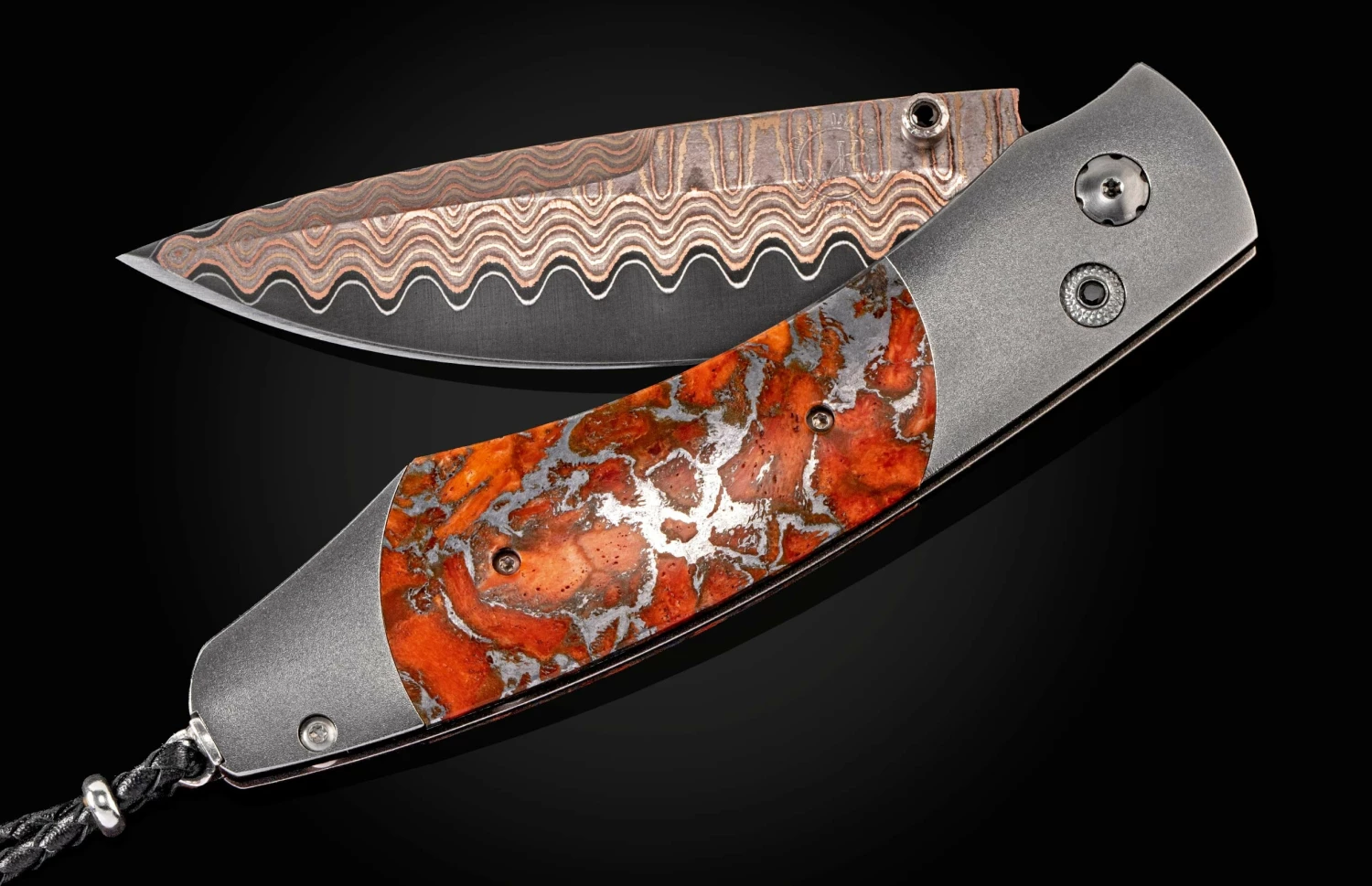 The Spearpoint ‘Laguna’ features a light and resilient frame in aerospace grade titanium, inlaid scales of beautiful apple coral. The blade is in William Henry’s signature ‘copper wave’ damascus steel with an extra sharp core in VG-5 steel; the one-hand button lock and the thumb stud are set with spinel gemstones. A remarkable design that gives you an instrument with a full-size secure grip, and a versatile deep-belly blade, the Spearpoint epitomizes William Henry’s core philosophy – that superlative function deserves to be elevated to superlative art. The ‘Laguna’ features some of the exotic materials and hand-forged metals that are the hallmark of William Henry’s collections; a distinctive personality statement to be worn and used for a lifetime.