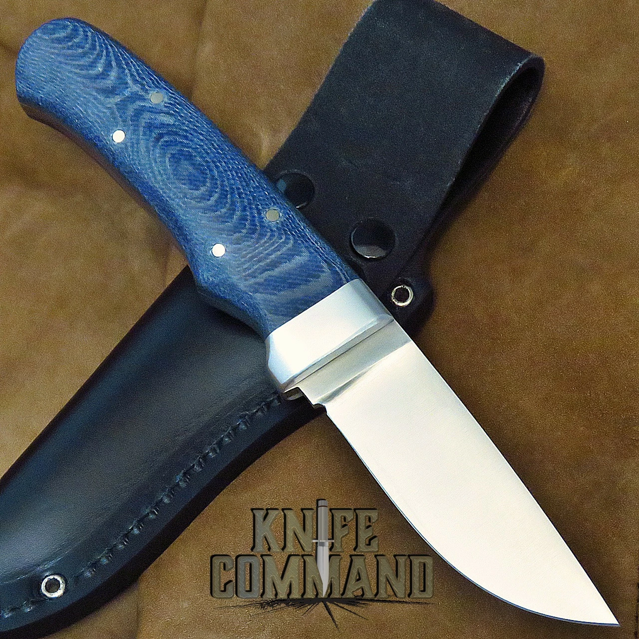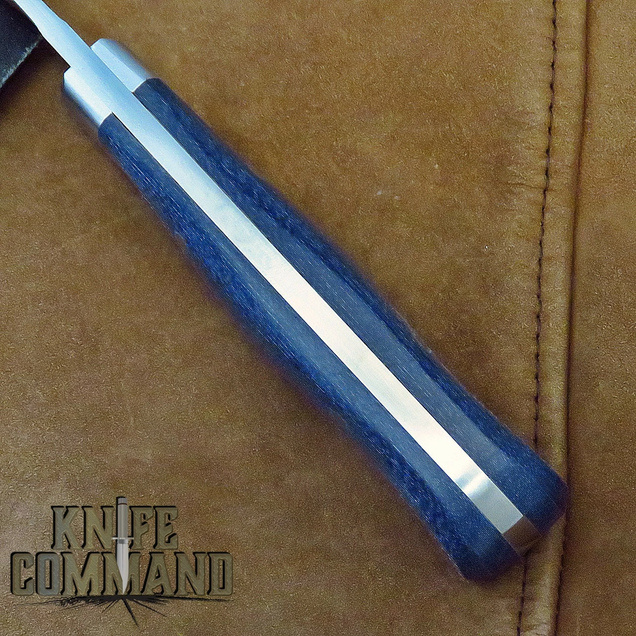 It has a 3-1/2″ blade and is approximately 8″ overall. The drop-point blade is satin finished 440C (Böhler N695) stainless steel. This hefty blade is 5mm thick. It features full tang construction with Contoured Blue Jeans Denim Micarta handles. A brushed aluminum bolster heads up the handle. For carrying, a high quality leather belt sheath is included.