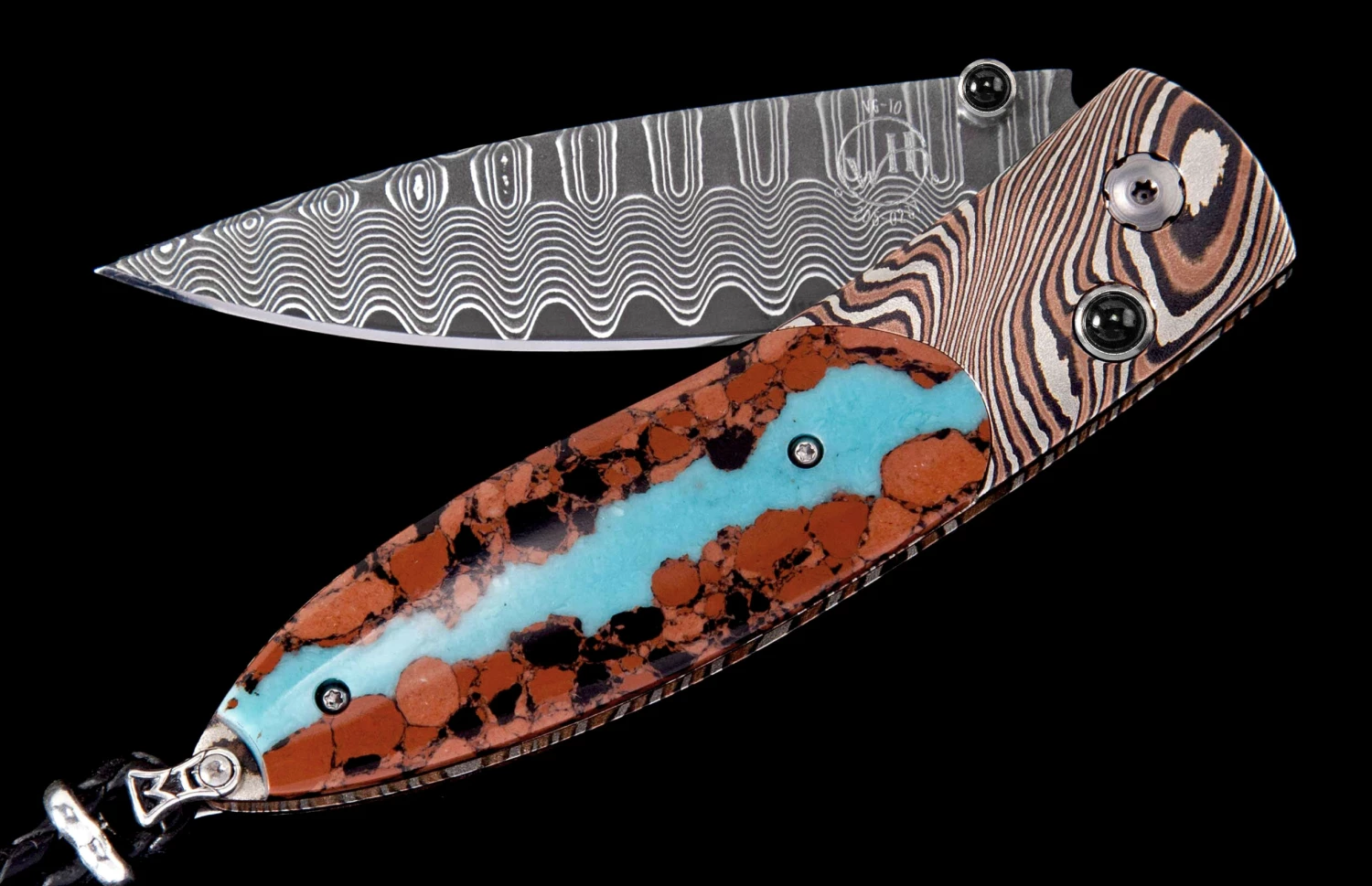 The Monarch ‘Magma’ features a beautiful frame in ‘Twist’ Mokume Gane by Mike Sakmar, inlaid with turquoise and lava rock; the blade is ‘Wave’ damascus with a VG-10 core; the one-hand button lock and the thumb stud are set with black onyx gemstones.