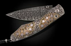 The Spearpoint ‘Mandala’ features a stainless steel frame, hand-engraved with 5 separate colored gold inlays by Tyler Prince. The beautiful hand-forged blade is etched ‘Pinwheel’ damascus steel by Robert Eggerling; the one-hand button lock and the thumb stud are set with spinel gemstones.
