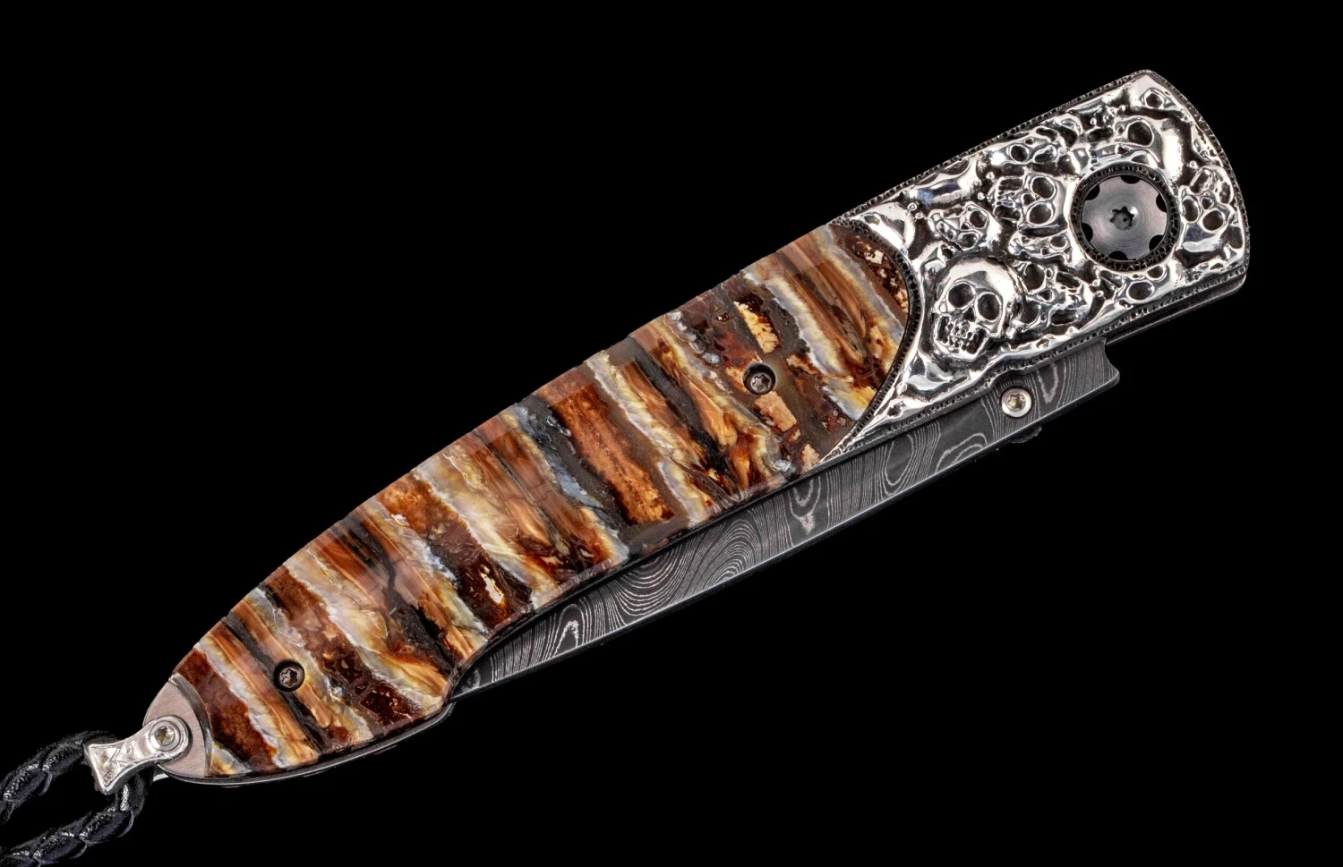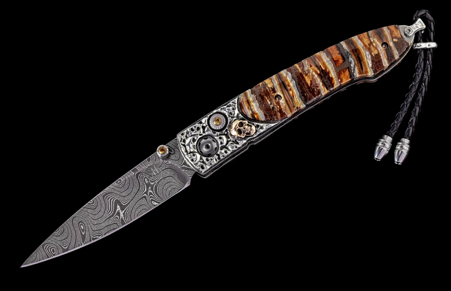 The Lancet ‘Marauder’ features a beautiful frame in hand-carved sterling silver and gold by Lee Downey, inlaid with mesmerizing 10,000 year-old Woolly Mammoth tooth. The blade is hand-forged ‘Boomerang’ damascus by Chad Nichols; the one-hand button lock and the thumb stud are set with citrine gemstones. Sleek, elegant, refined, and comfortable in the hand and to the eye, the Lancet defines the essential gentleman’s folder in the modern world. The ‘Marauder’ features some of the exotic materials, artistry, and hand-forged metals that are the hallmark of William Henry’s collections.
