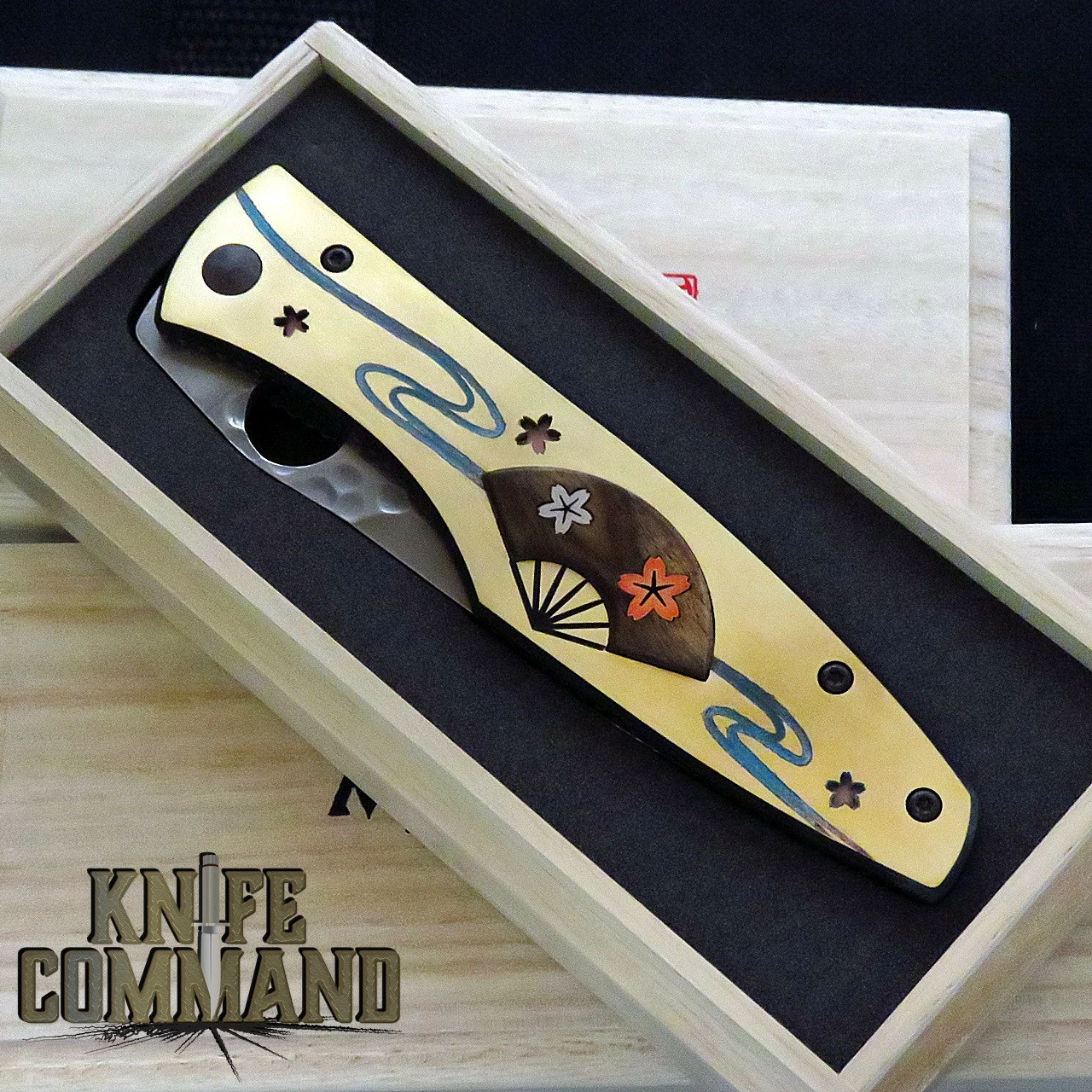 The Spring folder is 4-3/4″ closed, 8-3/8″ open length. The .11″m thick, 3-5/8″ long, Hollow ground, drop-point blade has a fine cutting edge, thumbhole, and is made of San Mai SPG2 Powder steel and features traditional hammer marks. The Brass handle features a stunning inlaid Spring motif inspired from an important Edo Period (c. 1700) Japanese National Treasure art screen. It has a precious Japanese Persimmon wood Folding Fan inlaid with Blue stream lines running through it, and Sakura Cherry Blossom inlays representing Spring. The knife is a liner-lock design. The liners feature delicate jimping all the way around. Each knife is individually serial numbered on the bottom side of the blade tang. It comes in a wooden presentation box with padded interior, paper, and a shelf display stand.