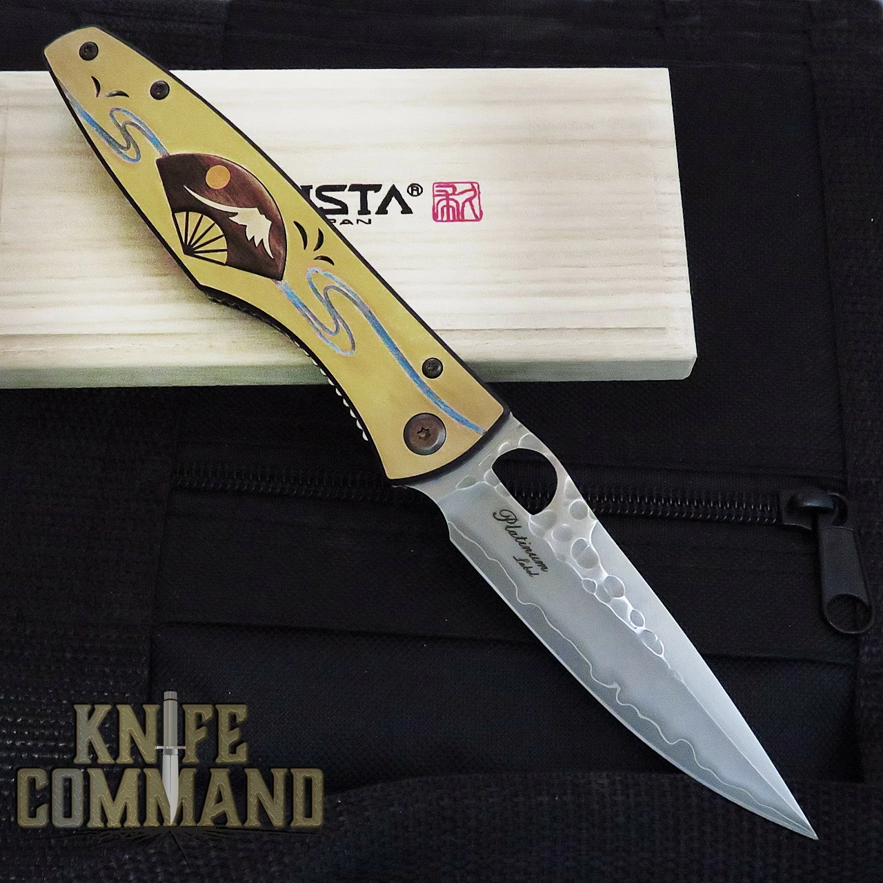This is the latest Platinum Label custom limited edition knife, themed as the “Japanese Four Seasons”. The Japanese National Treasure art screen shows floating folding fans in the water called “Oogi Nagashi” which was once graceful entertainment for aristocrats in medieval Japan. This traditional event is still held every May at the Mifune festival in Kyoto.