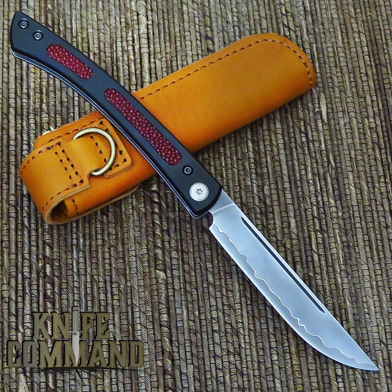 The Executive folding steak knife is a personal knife with beauty and elegance of Japanese design. Made in Seki, Japan, Mcusta combines modern technology with traditional Japanese craftsmanship to produce hand finished custom quality production knives. This limited edition knife measures 4.56″ long closed and features a 3.625″, 3-layer, VG-10 Core blade, HRC 60-61. The handle has a 420J2 frame with Black anodized aluminum handle scales and has custom Red stingray inlays on both sides. The blade features slipJoint action with strong detent at closed, half-way, and full open. Comes with special leather sheath with snap closure at top and zipper on side.
