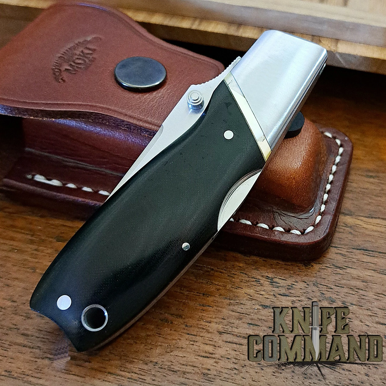 The Kingfisher folder is 4″ closed, 6-3/4″ open length. The 2.5mm” thick, 3″ long, trailing clip-point blade has a fine cutting edge, and is made of brushed finished VG-10 stainless steel. The handle has black Micarta scales on stainless liners with solid stainless bolsters. It also features 3 pins and a lined lanyard hole. Inlaid between the Micarta and bolsters is Gold Lip Pearl. The mid-handle lock back is very solid. This Limited Edition folder comes in the original Moki box complete with a fine Moki leather snap-flat belt sheath.