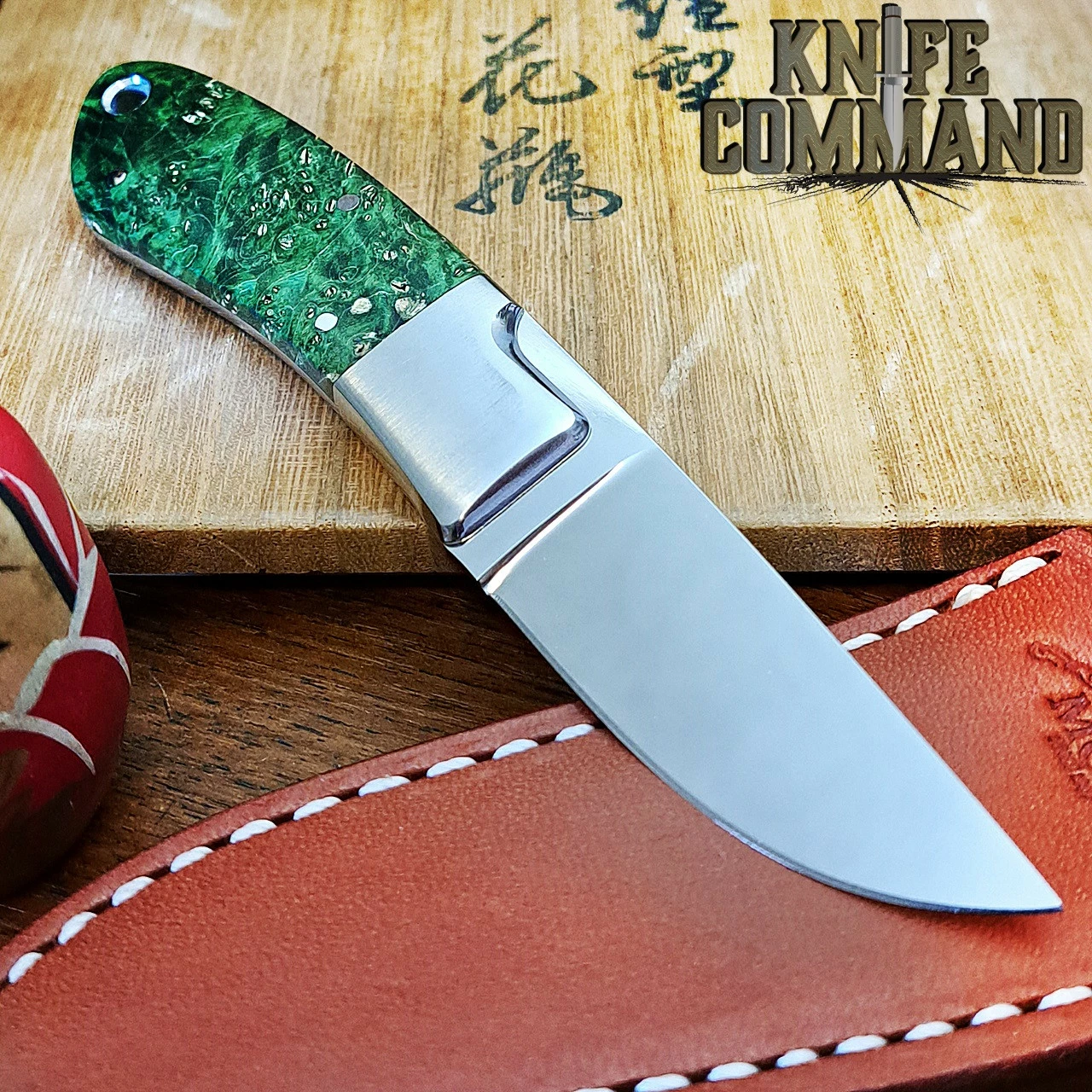 The beautiful Green Stabilized Maple Wood handles are held in place with 3 pins and a lined lanyard hole. This knife is supplied with a high quality leather Moki sheath and it comes in its original Moki box.