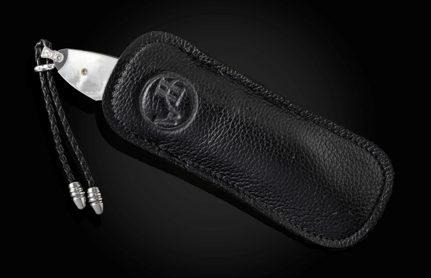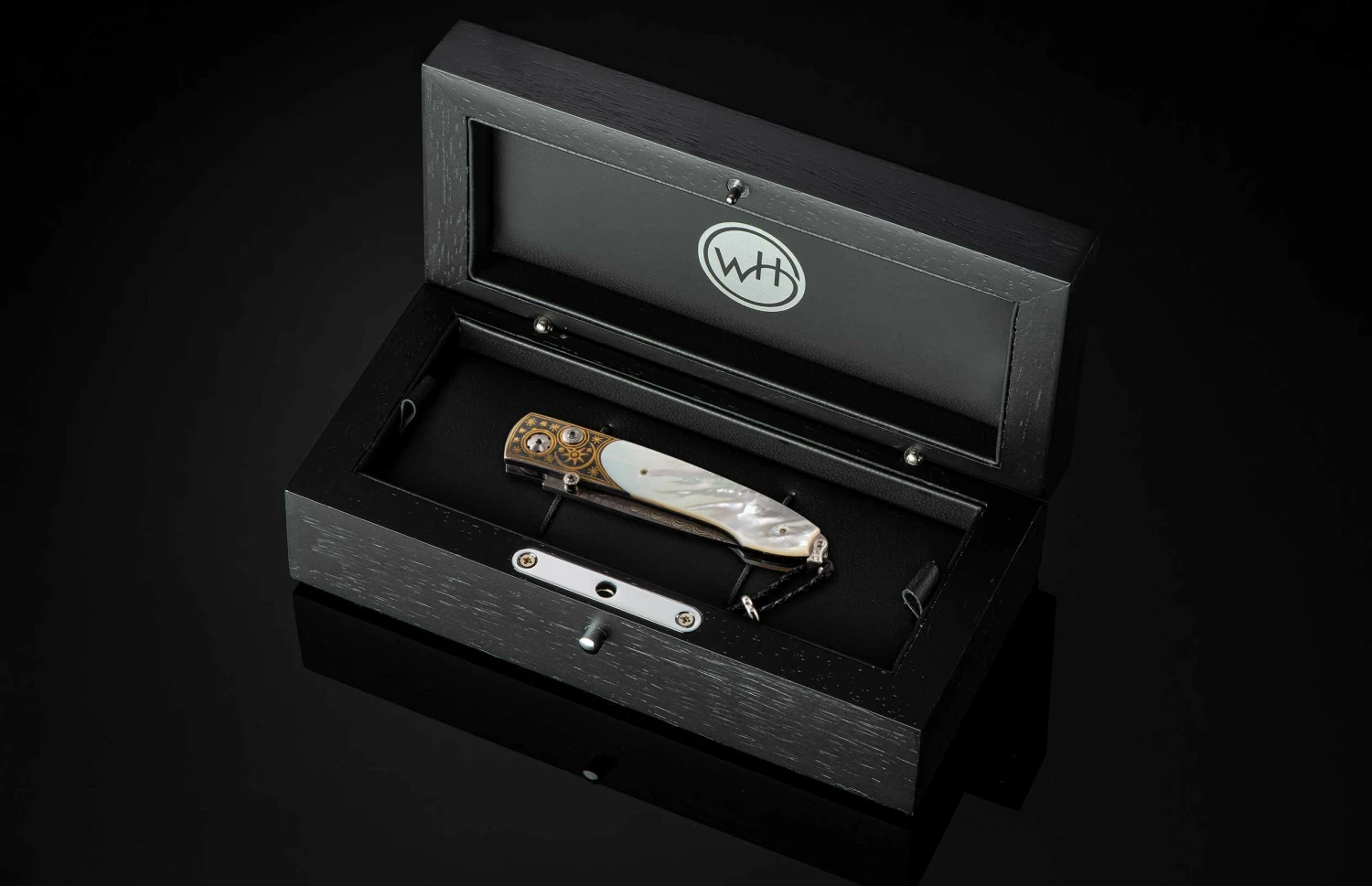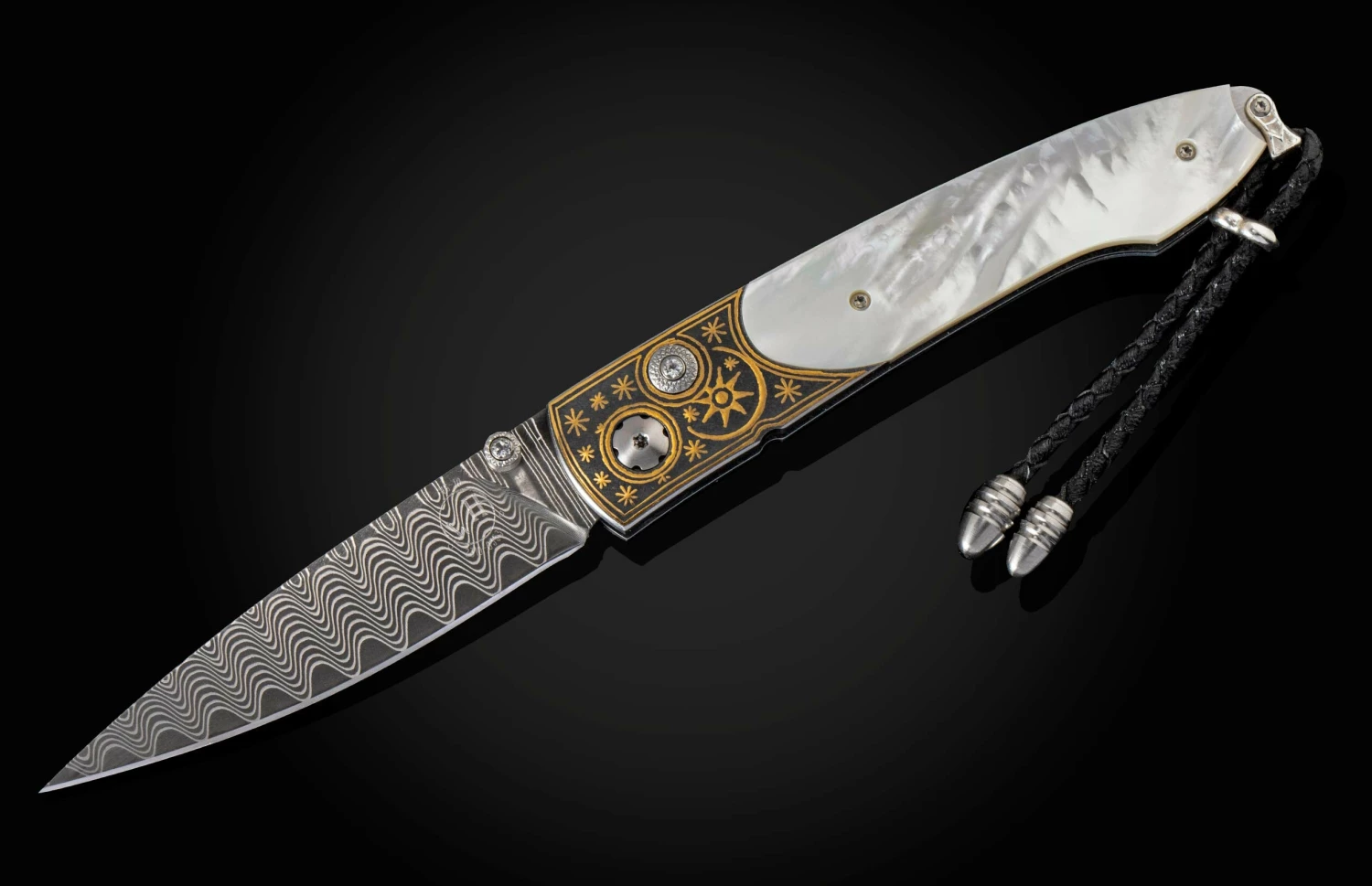 The Lancet ‘Night Sky’ features a beautiful frame in 24K gold koftgari (the ancient Indian art of inlaying gold in tool steel), inlaid with mother of pearl. The blade is William Henry’s signature ‘Wave’ damascus with a core of VG-10; the one-hand button lock and the thumb stud are set with white topaz gemstones. Sleek, elegant, refined, and comfortable in the hand and to the eye, the Lancet defines the essential gentleman’s folder in the modern world. The ‘Night Sky’ features some of the exotic materials, artistry, and hand-forged metals that are the hallmark of William Henry’s collections; a stunning personality statement to be used and worn for a lifetime, before handing it down to another generation.