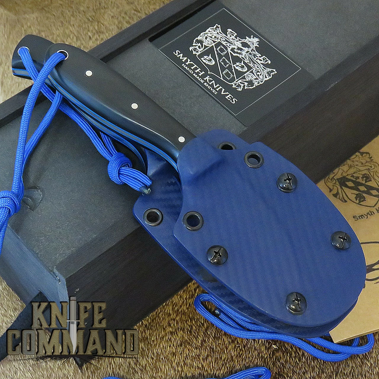 The Custom Blue Carbon Fiber Kydex Combo sheath holds both knives securely and has a belt sheath attachment. This beautiful combo is supplied with a Paddy Smyth signed specifications card. and is shipped in a wooden, wine bottle style box with sliding lid.