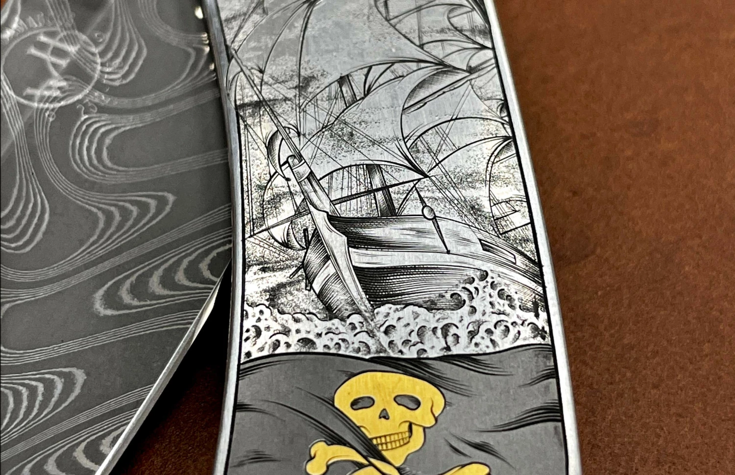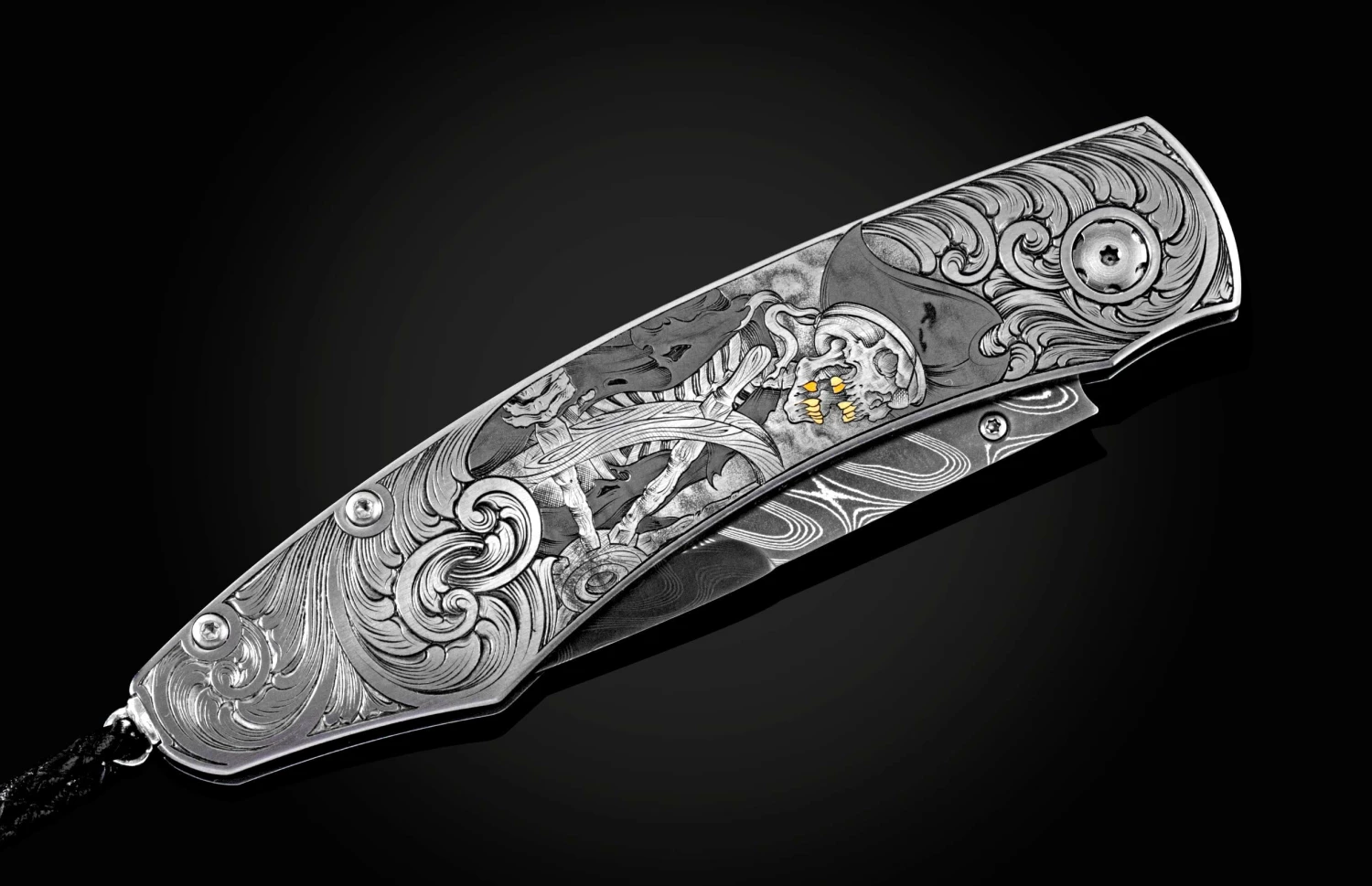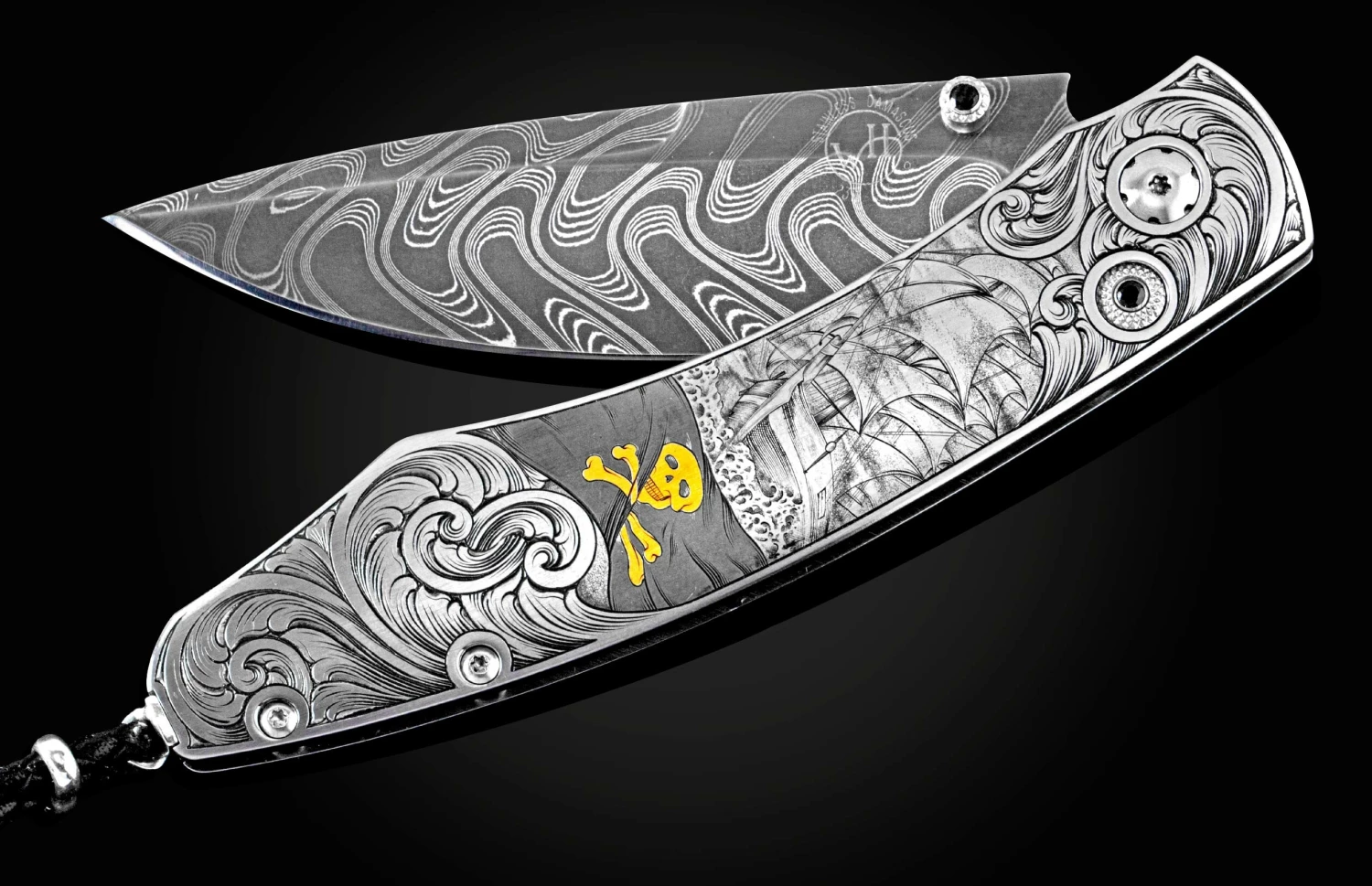 The Spearpoint ‘Pirate Captain’ features a stainless steel frame, hand-engraved with 24K gold inlays by Richard Quecke. The blade is hand-forged ‘Boomerang’ damascus by Chad Nichols; the one-hand button lock and the thumb stud are set with spinel gemstones. A remarkable instrument with a full-size secure grip and versatile deep-belly blade, the Spearpoint epitomizes William Henry’s core philosophy – that superlative function deserves to be elevated to superlative art. The ‘Pirate Captain’ features hand-forged metals, and hundreds of hours of microscopic hand-engraving which are the hallmark of William Henry’s most exclusive creations; a timeless heirloom to be proudly worn and used for a lifetime before being handed-down to another generation.