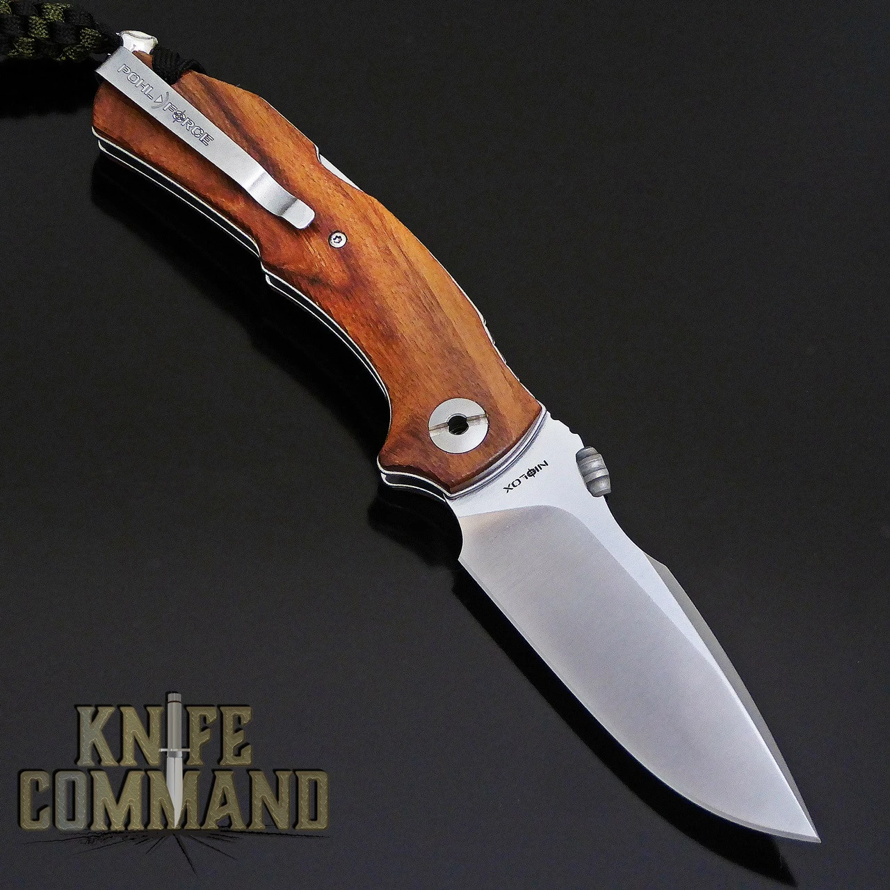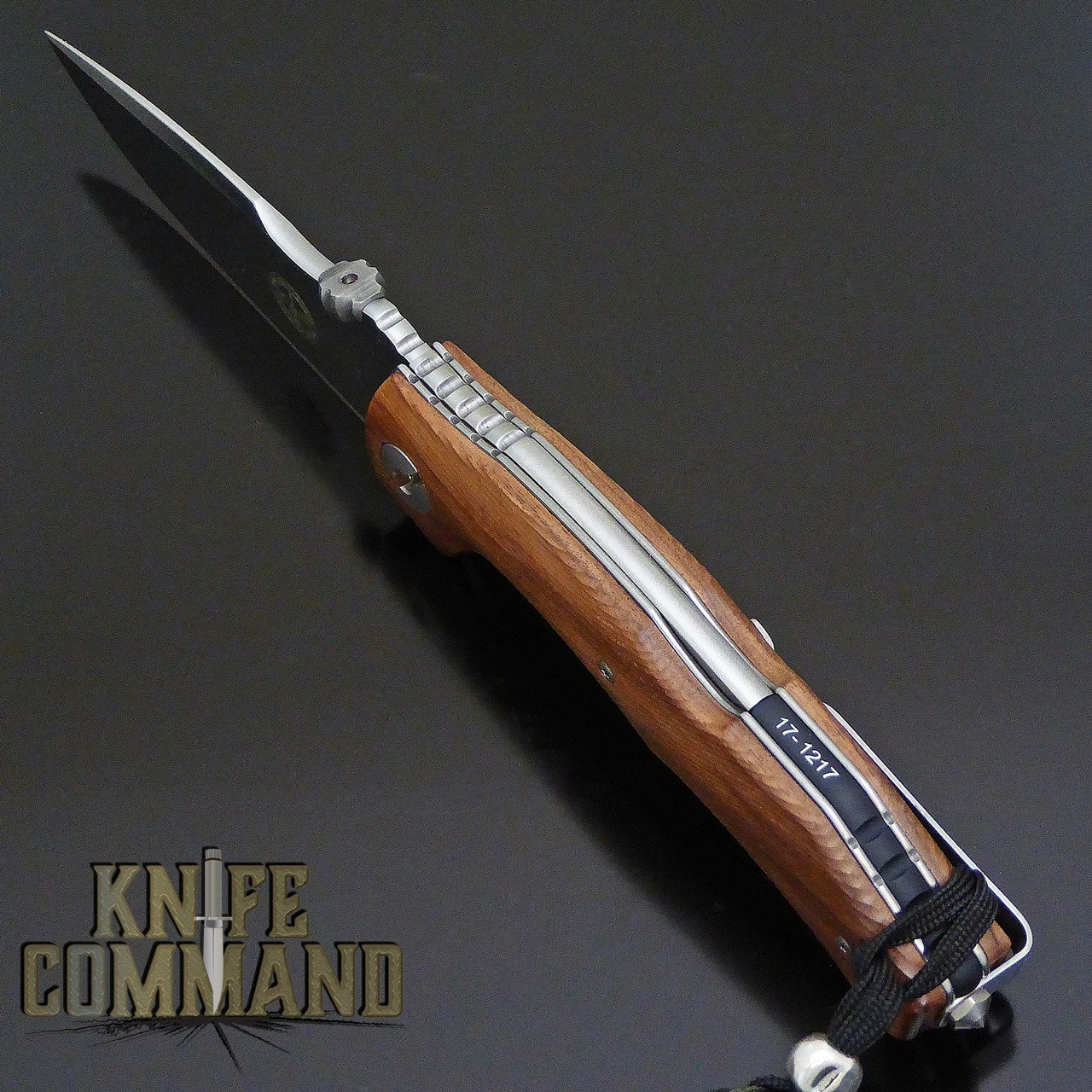 The Mike Five Santos measures 8-5/8″ open length, 5″ closed length, and weighs 6.1 oz. The 4mm thick, satin finished blade is 3-3/4″ long and is forged from Niolox stainless steel. This drop point blade can be opened with two hands, or, install the included thumb disc for easy one-hand opening. To make it even faster to deploy, Lion Steel has outfitted it with an IKBS ball bearing pivot. The handle features a Double-Spring Lock-Back mechanism which provides optimum clamping force and increases the longevity of the spring construction. The beautiful Santos Wood scales sit on top of 1.3mm thick polished steel liners. An elaborately rounded and polished stainless steel liner and a black anodised aluminum spacer give the handle the necessary stability. The Pohl Force pocket clip is reversible for right or left hand carry and it comes with a braided paracord lanyard with skull bead. To top it off, it even has a tungsten carbide glass breaker. The Mike Five Santos is brand new in box, complete with a Certificate of Authenticity, Pohl Force sticker, rubber patch, and zippered Pohl Force pouch.