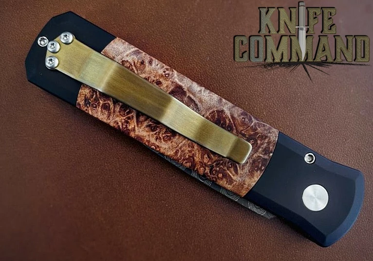 This model 706-Dama Godson is 7.56″ in overall length with a 3.15″ spear point blade of Chad Nichols Ladder Damascus stainless steel. The fine edge blade is .125″ thick. It has a 4.5″ handle made of 6061-T6 black aluminum with Maple Burl Wood inlays. The knife thickness is .49″ and weighs 3.2 ounces. This is a right-hand, tip-up, push button automatic folder. It features a Mosaic push button and a bronze anodized titanium pocket clip.