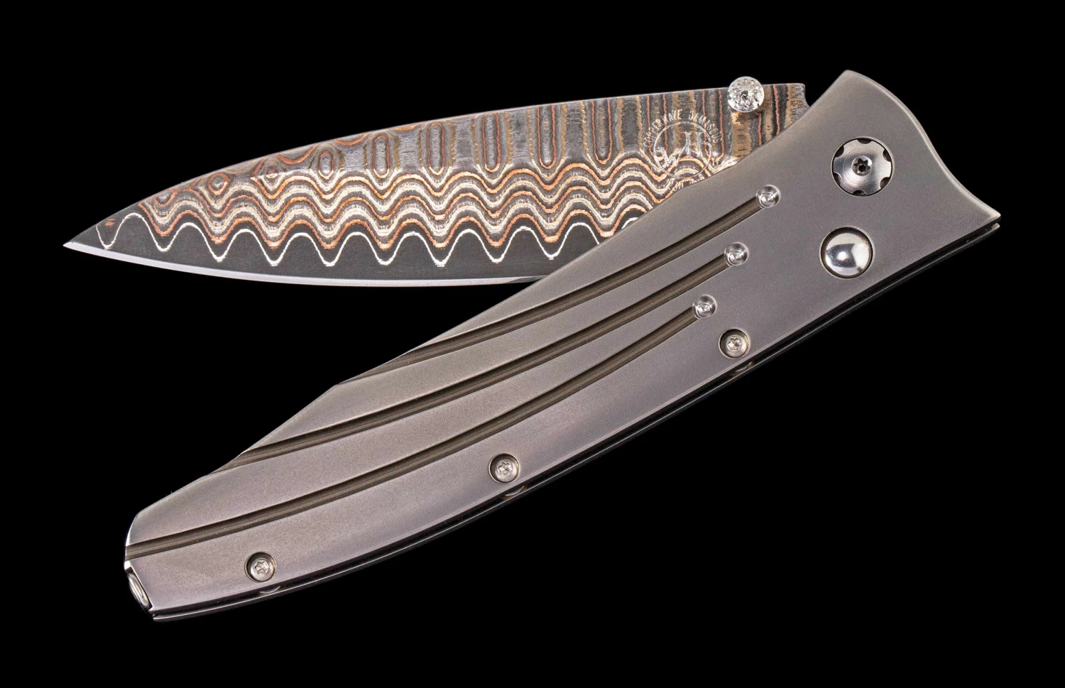 The Gentac ‘Saturn III’ features a light and resilient frame in aerospace grade titanium, with titanium pocket clip. The blade is William Henry’s ‘Copper Wave’ damascus with a VG-5 core; the one-hand button lock and the thumb stud are stainless steel. An exceptional design that offers rigorous performance in a sleek, comfortable knife, the ‘Saturn III’ features some of the hi-tech and forged metals that are the hallmark of William Henry’s collections; a distinctive personality statement to be worn and used for a lifetime.