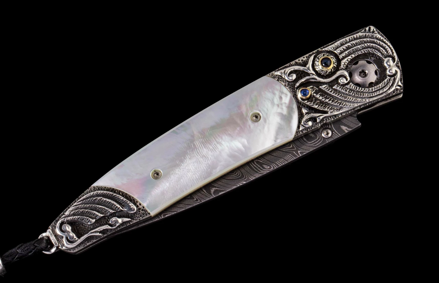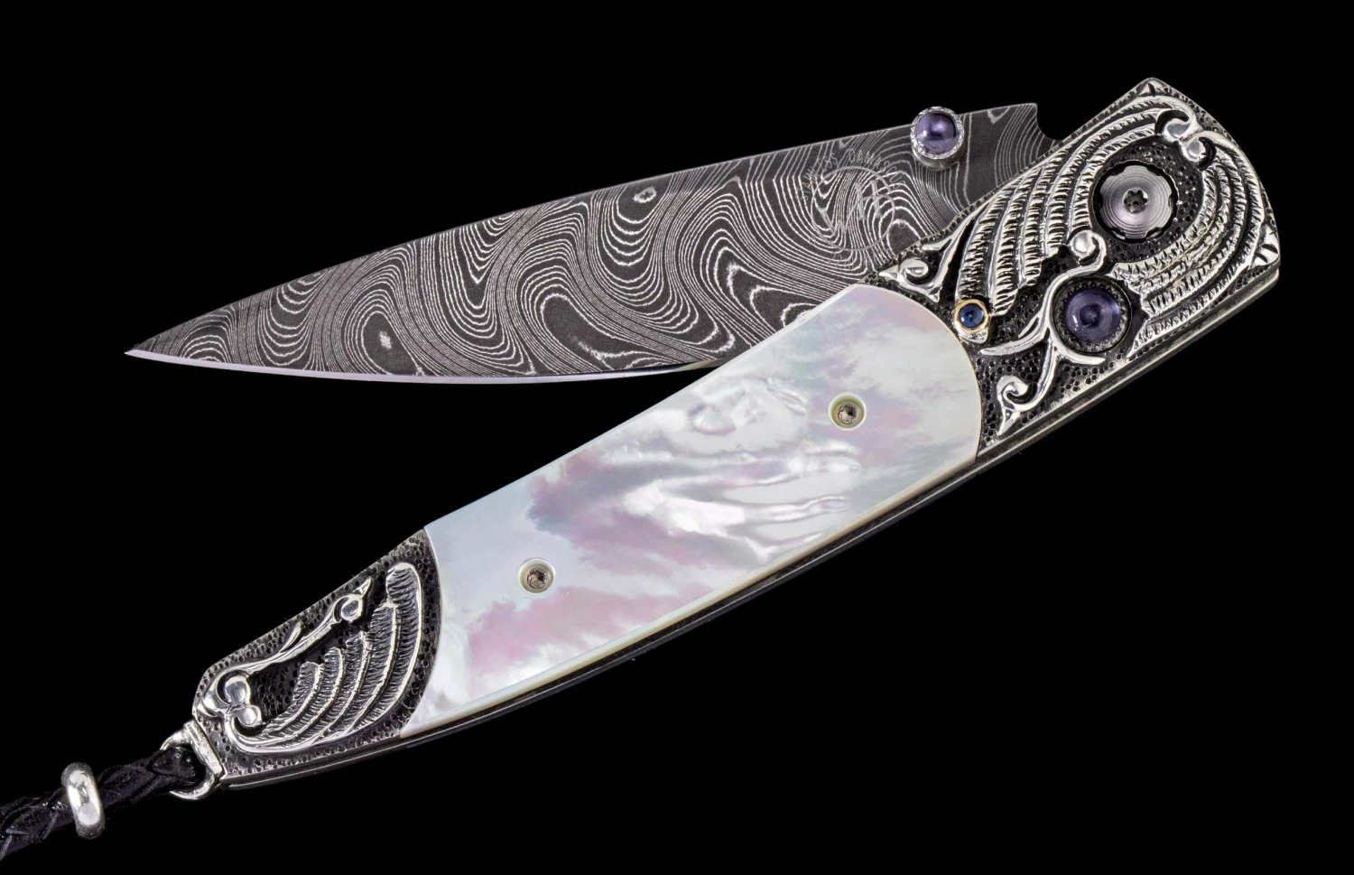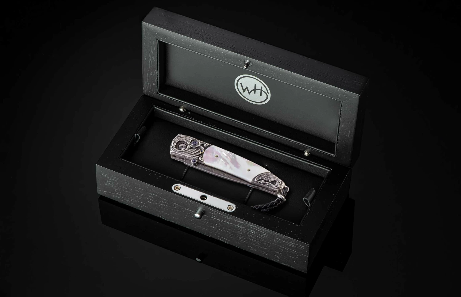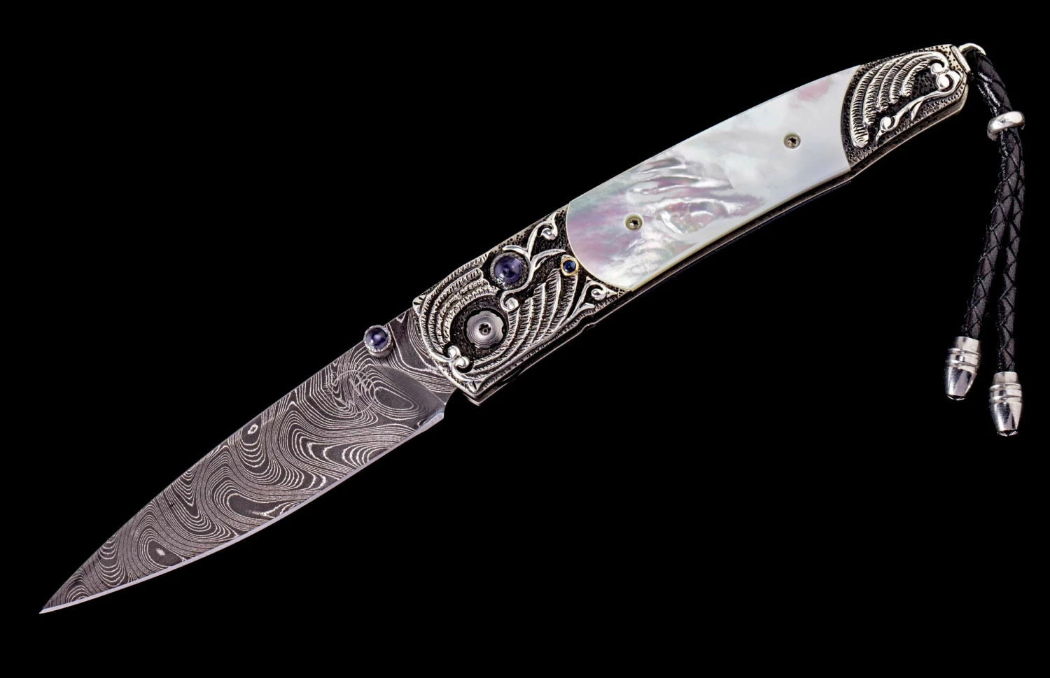 The Lancet ‘Sea Crest’ features a beautiful frame in hand-carved sterling silver, inlaid with white Mother of Pearl. The blade is hand-forged ‘Boomerang’ damascus by Chad Nichols; the one-hand button lock and the thumb stud are set with iolite gemstones. Sleek, elegant, refined, and comfortable in the hand and to the eye, the Lancet defines the essential gentleman’s folder in the modern world. The ‘Sea Crest’ features some of the exotic materials, artistry, and hand-forged metals that are the hallmark of William Henry’s collections.