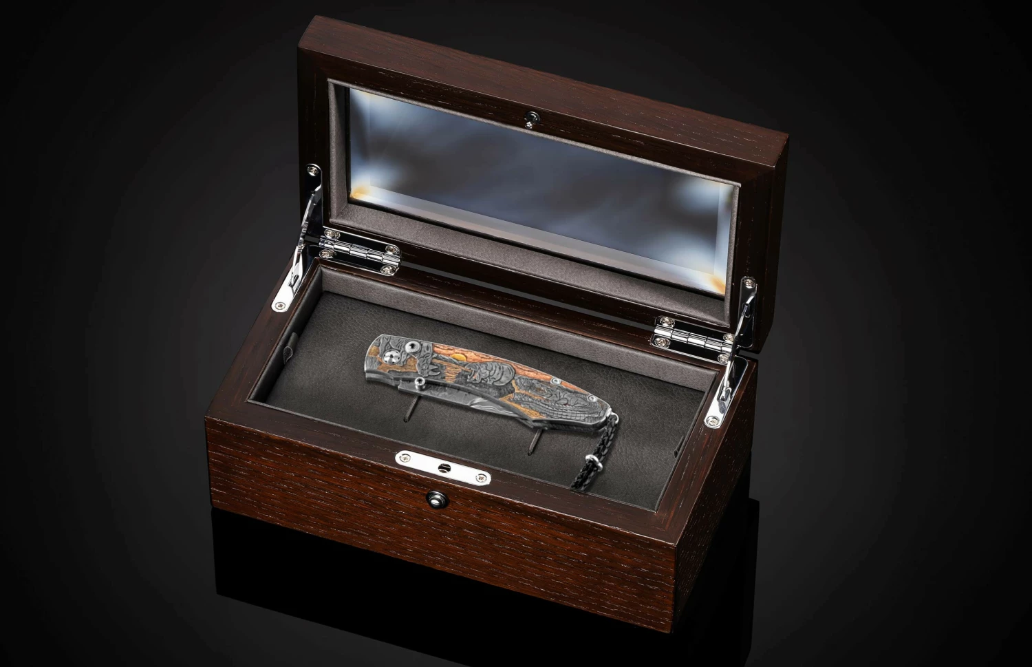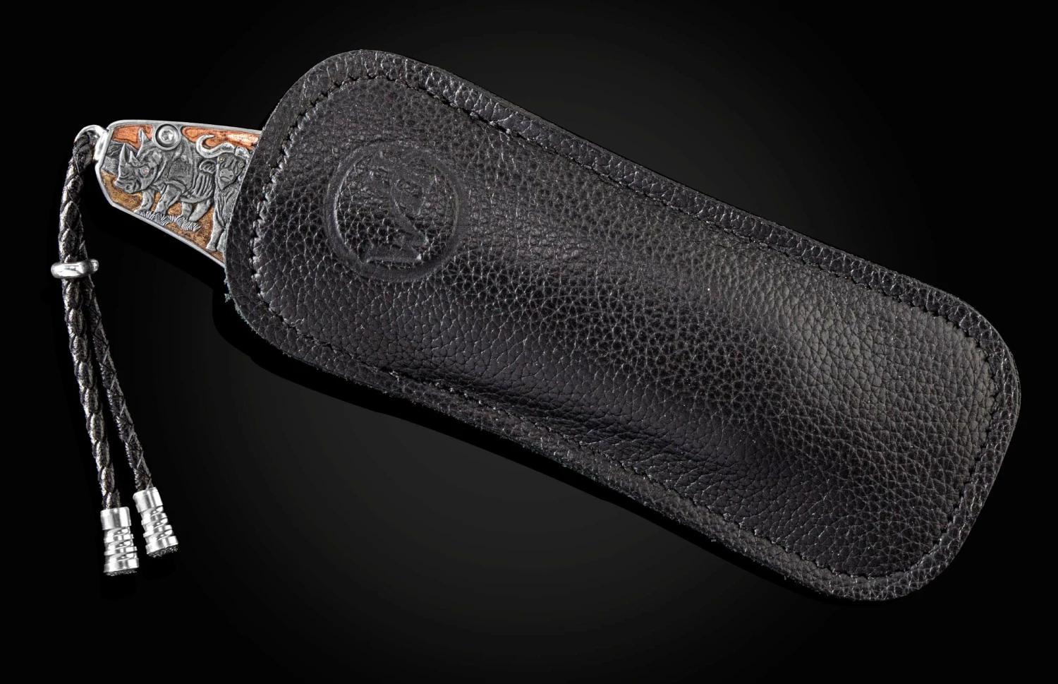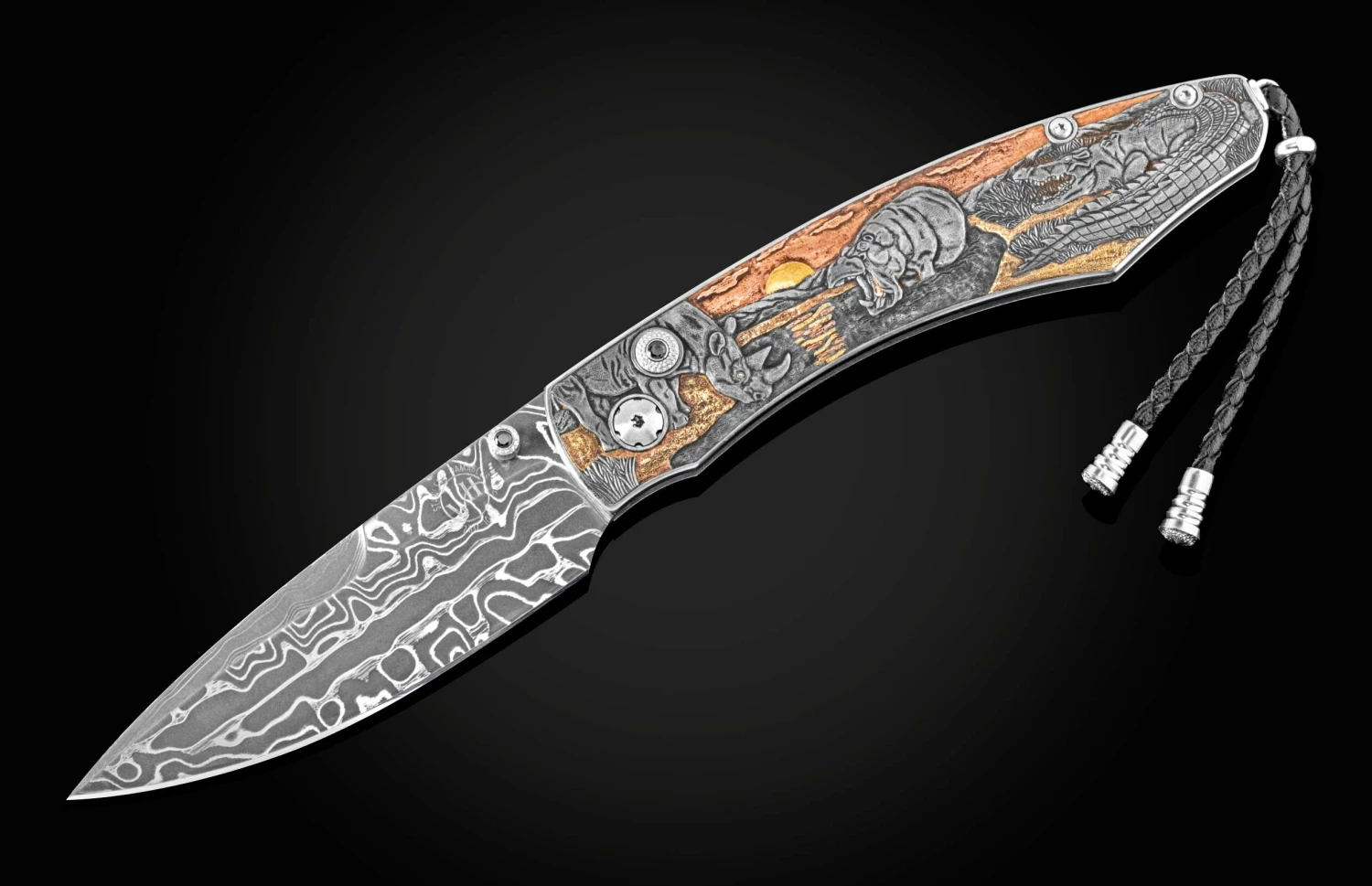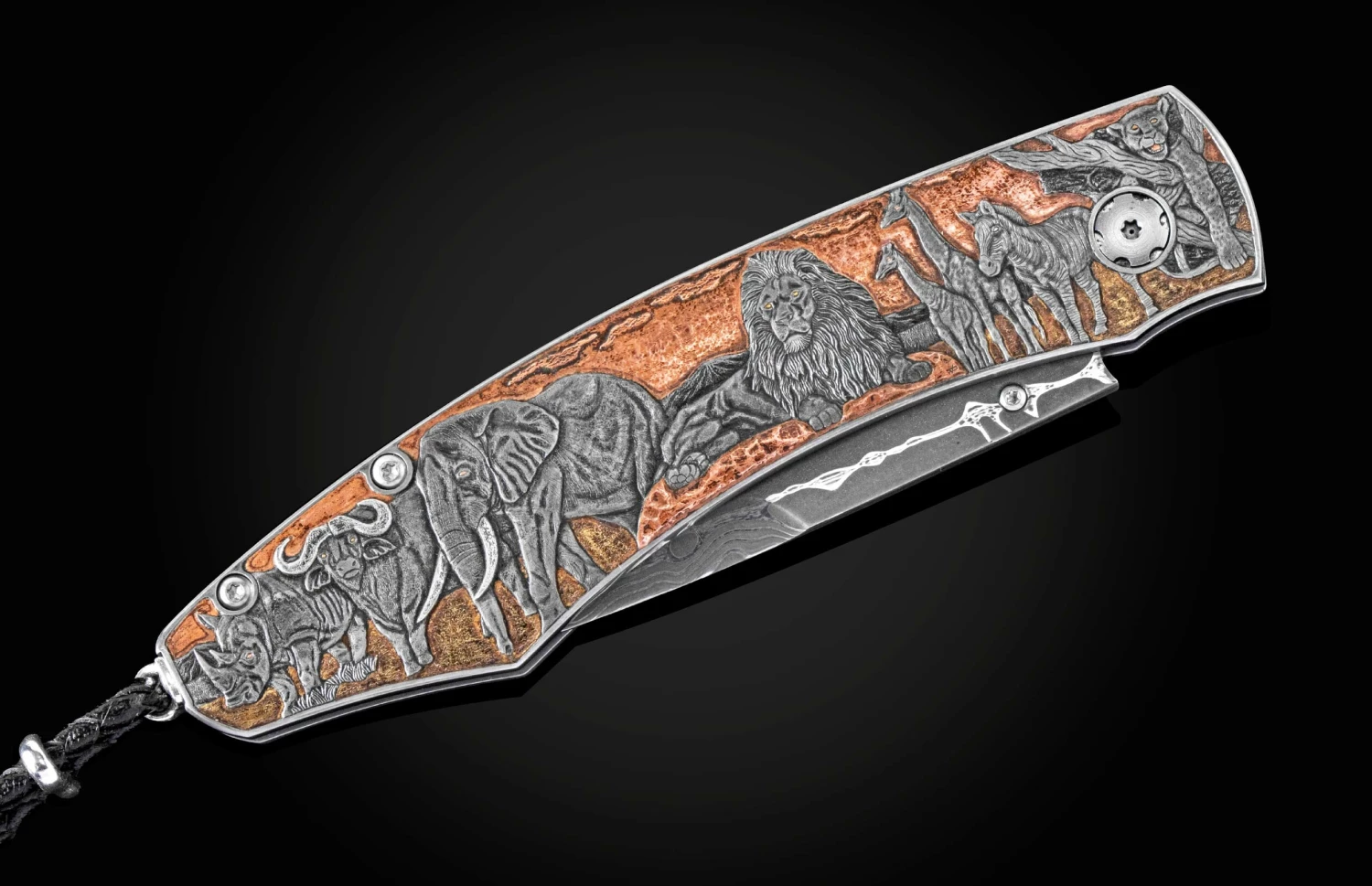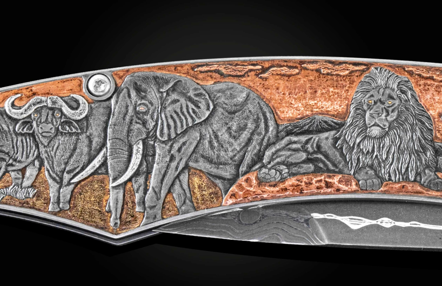 The Spearpoint ‘Serengeti’ features intricately detailed, hand-engraved handles with silver, copper, brass and 24K gold inlays by Narimantis Palsis. The blade is hand-forged ‘Intrepid’ damascus by Chad Nichols; the one-hand button lock and the thumb stud are set with black diamonds. A remarkable design that gives you an instrument with a full-size secure grip, and a versatile deep-belly blade, the Spearpoint epitomizes William Henry’s core philosophy – that superlative function deserves to be elevated to superlative art. ‘Serengeti’ features some of the most exotic materials, artistry and forged metals that are the hallmark of William Henry’s collections; a timeless heirloom to be proudly worn and used for a lifetime before being handed-down to another generation.