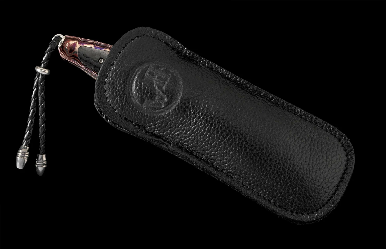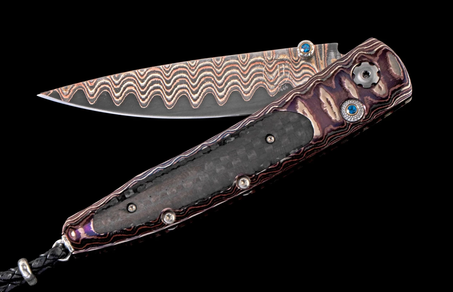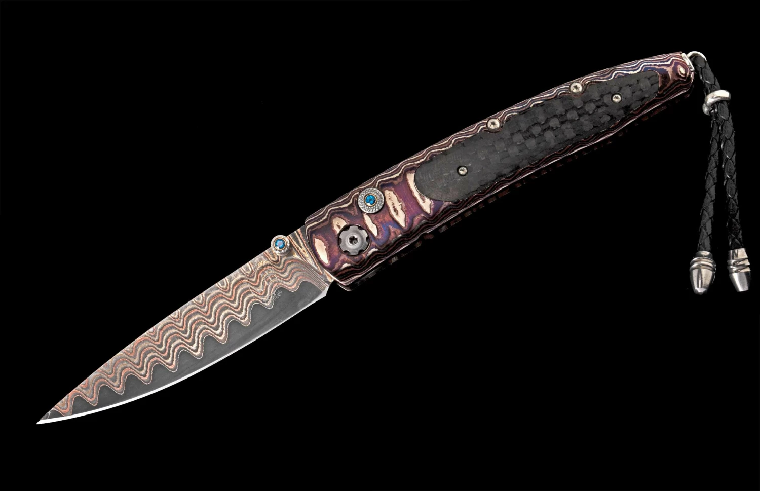 The Lancet ‘Silicon’ features a beautiful ‘Wave Mokume’ frame inlaid with carbon fiber. The stunning ‘Copper Wave’ damascus blade boasts an extra strong core in VG-10 for superb strength and longevity. The one-hand button lock and the thumb stud are set with fine Kashmir Blue topaz gemstones. This knife is an outstanding example of William Henry craftsmanship. Sleek, elegant, refined, and comfortable in the hand and to the eye, the Lancet defines the essential gentleman’s folder in the modern world. The ‘Silicon’ features some of the exotic materials and hand-forged metals that are the hallmark of William Henry’s collections; a timeless heirloom to be proudly worn and used for a lifetime before being handed-down to another generation.