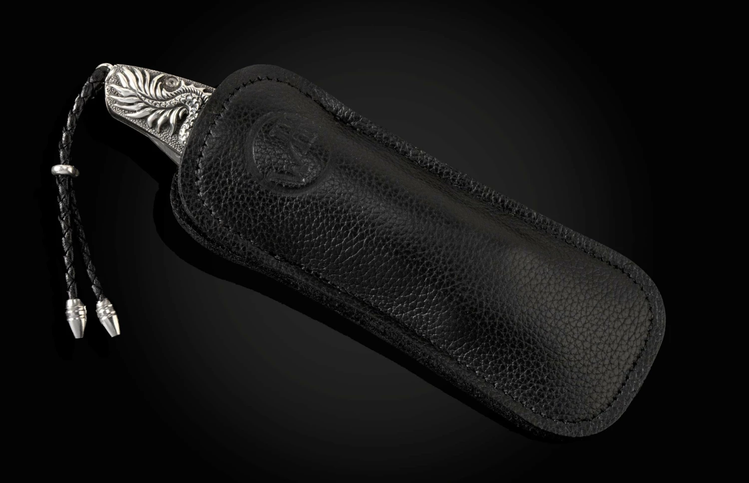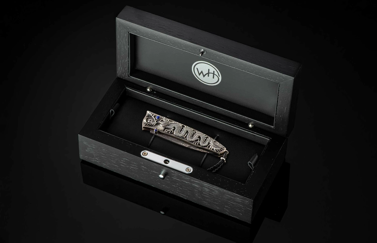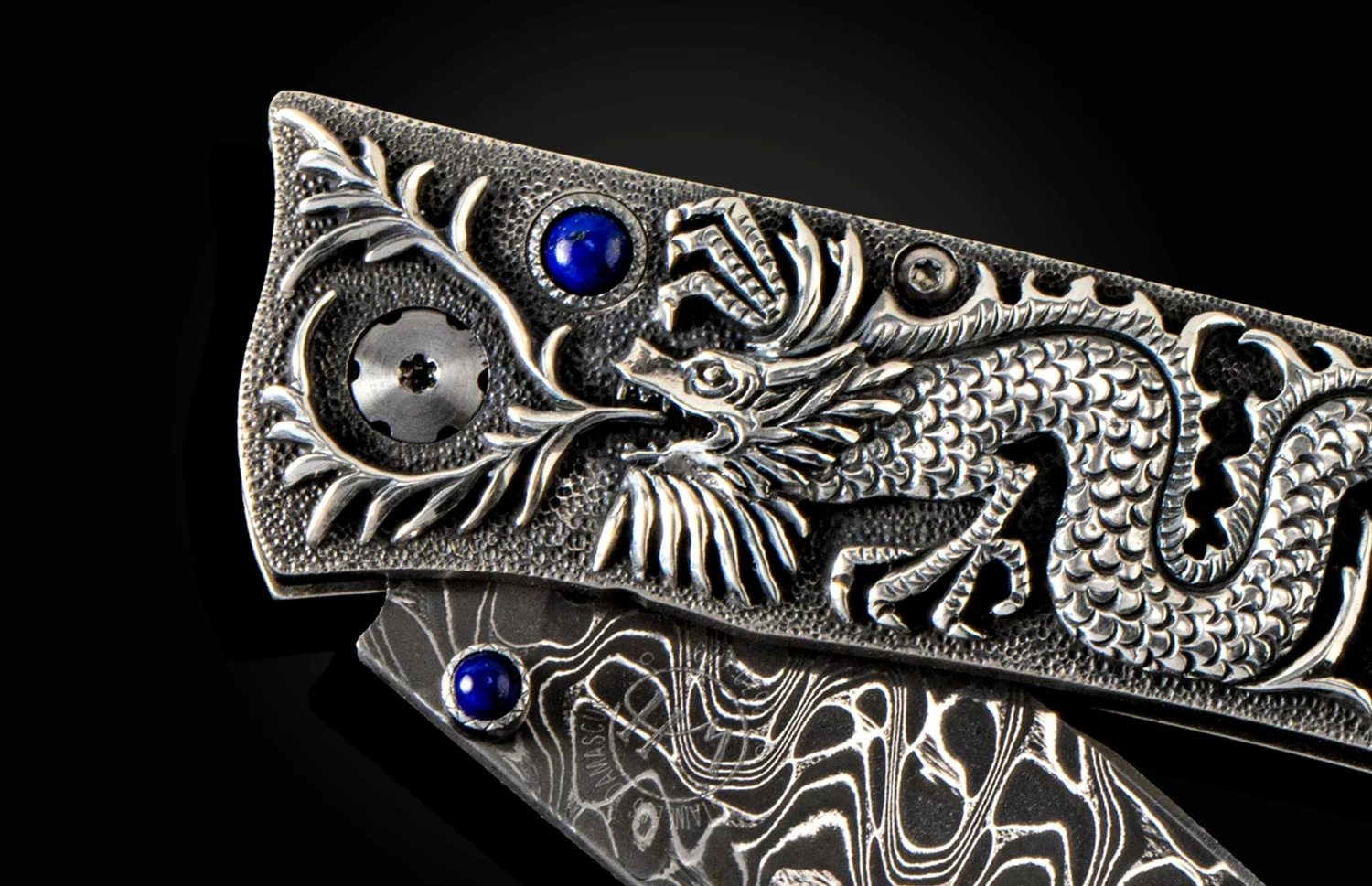 The Gentac ‘Silver Dragon’ features an intricate frame in hand-carved sterling silver by Lee Downey. The blade is hand-forged ‘Intrepid’ damascus by Chad Nichols. The one-hand button lock and the thumb stud are set with lapis lazuli gemstones. An exceptional design that offers rigorous performance in a sleek, comfortable knife, the Gentac is also the perfect canvas to showcase William Henry’s range of exotic materials and techniques. The ‘Silver Dragon’ features some of the unique materials, artistry, and metals that are the hallmark of William Henry’s collections.