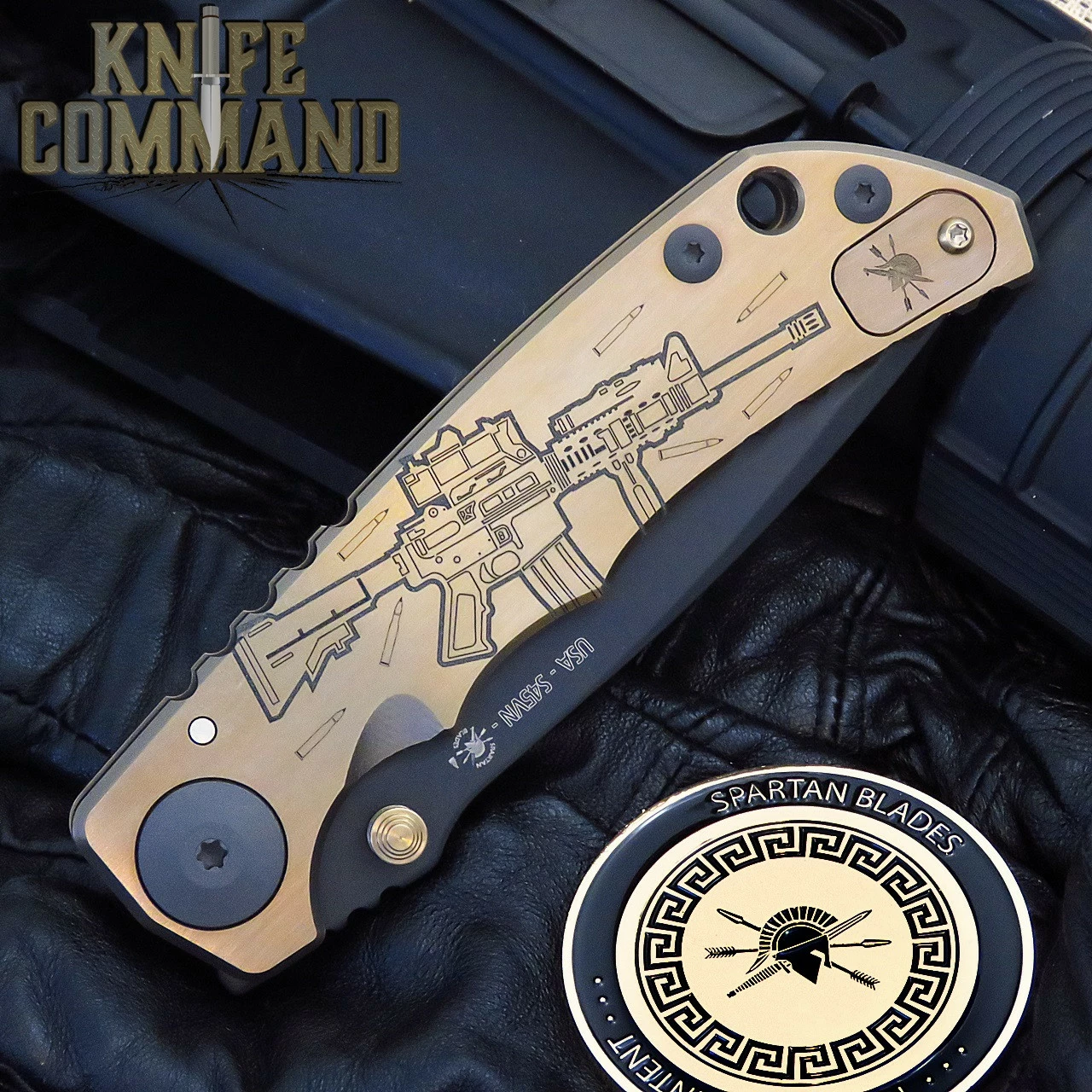 This variation of the Spartan Harsey Folding Knife features bronzed titanium handle scales. This is Special Edition knife has a built M4 rifle and bullets on one side, original script from the 2nd Ammendment of the US Constitution on the other. The black S45VN blade and black hardware make this one stunning piece.