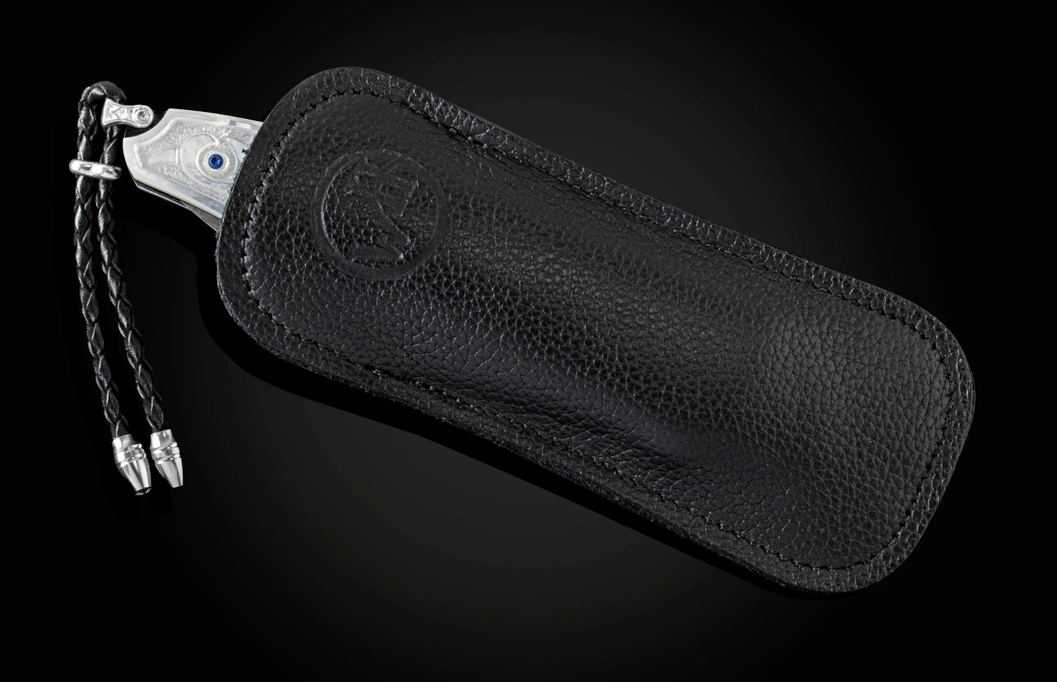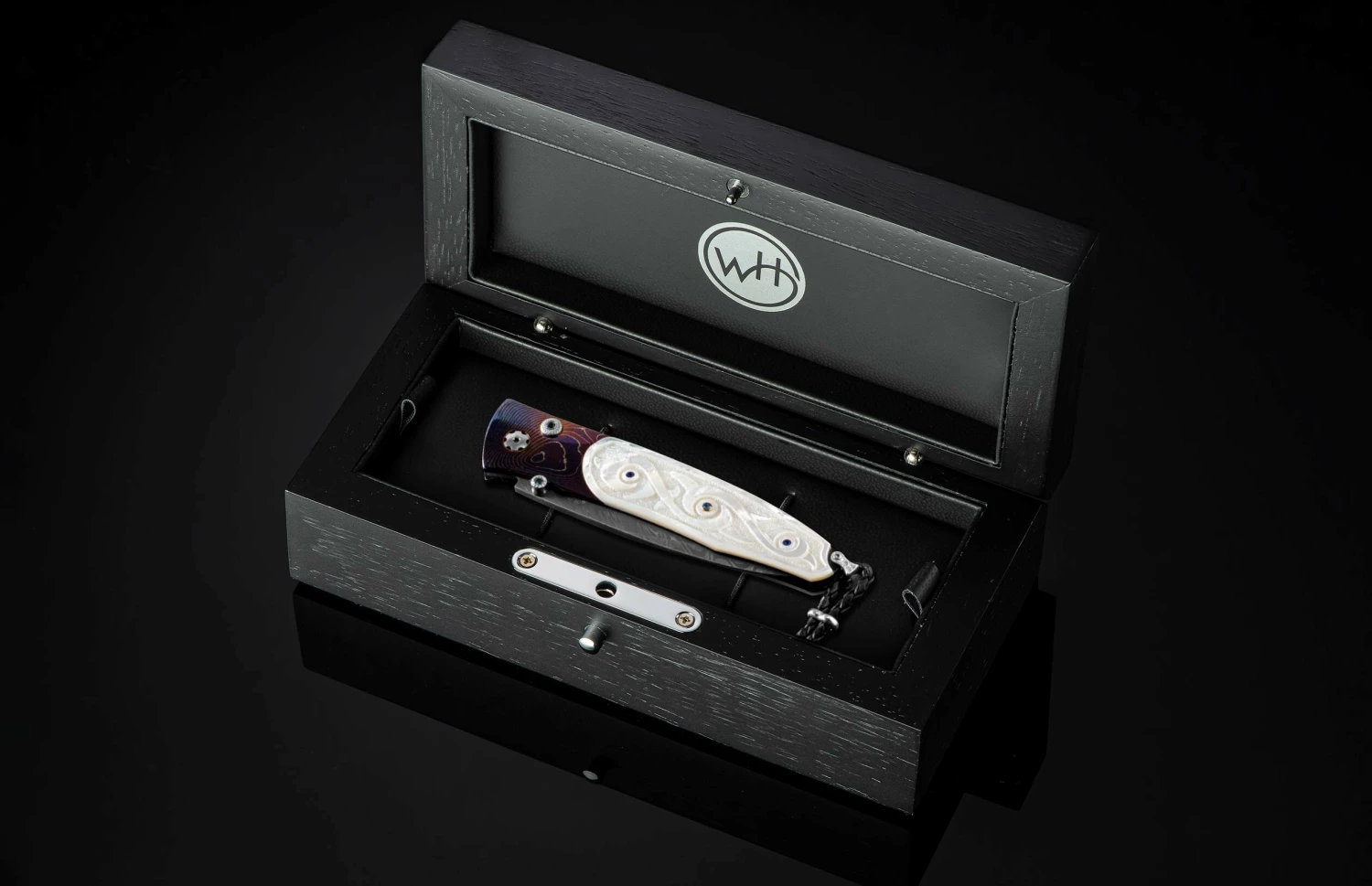 The Gentac ‘Swirl’ features an intricate frame in hand-forged and heat-blued ‘Twist’ damascus by Chad Nichols. The scales are hand carved Mother of Pearl with inset colored sapphires by Lee Downey. The blade is hand-forged ‘Boomerang’ damascus, also by Chad Nichols; the one-hand button lock and the thumb stud are set with London Blue topaz gemstones. An exceptional design that offers rigorous performance in a sleek, comfortable knife, the Gentac is also the perfect canvas to showcase William Henry’s range of exotic materials and techniques. The ‘Swirl’ features some of the unique materials, artistry, and metals that are the hallmark of William Henry’s collections.