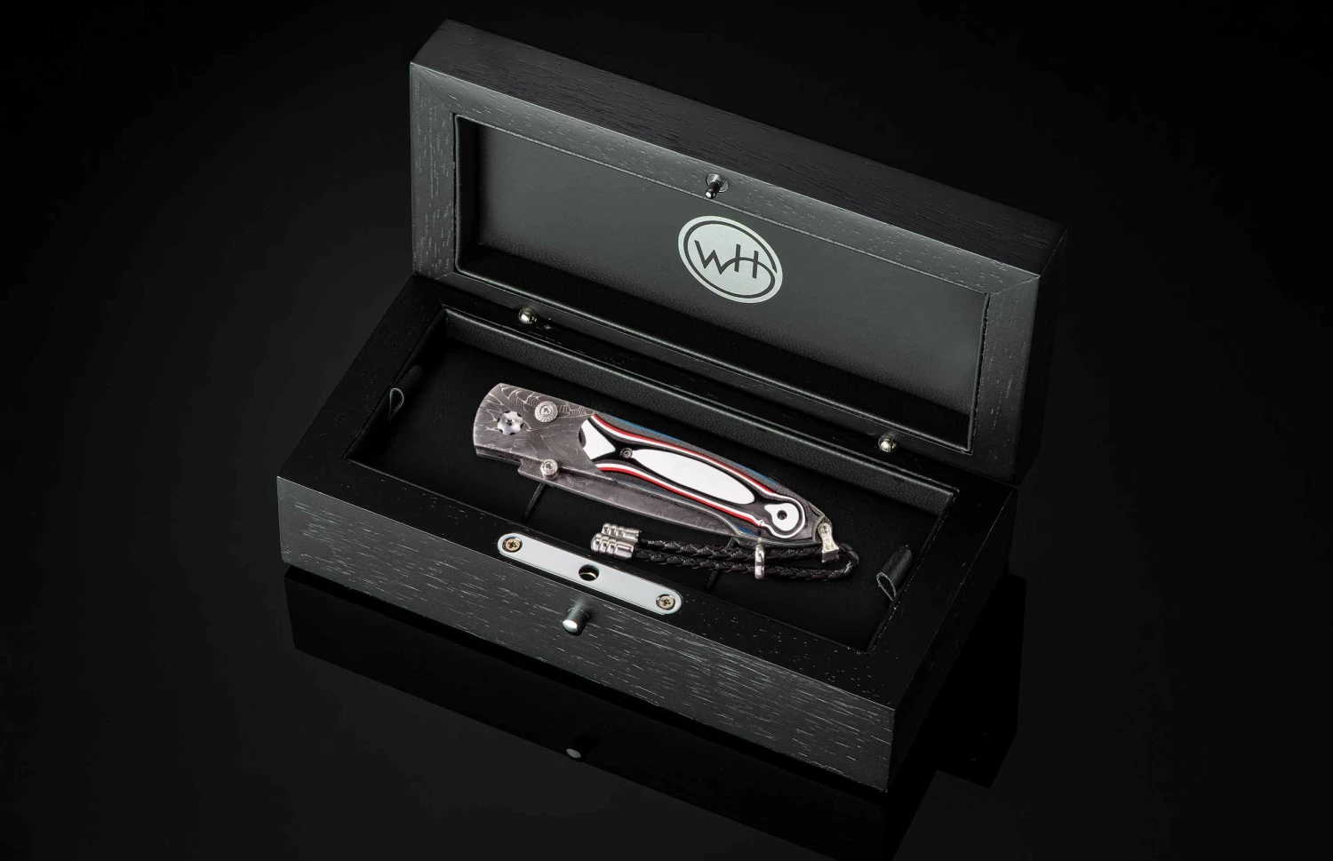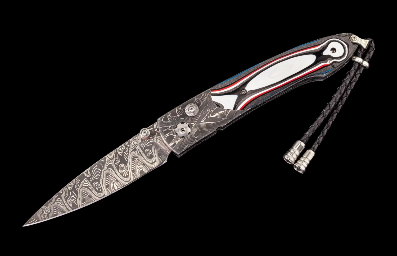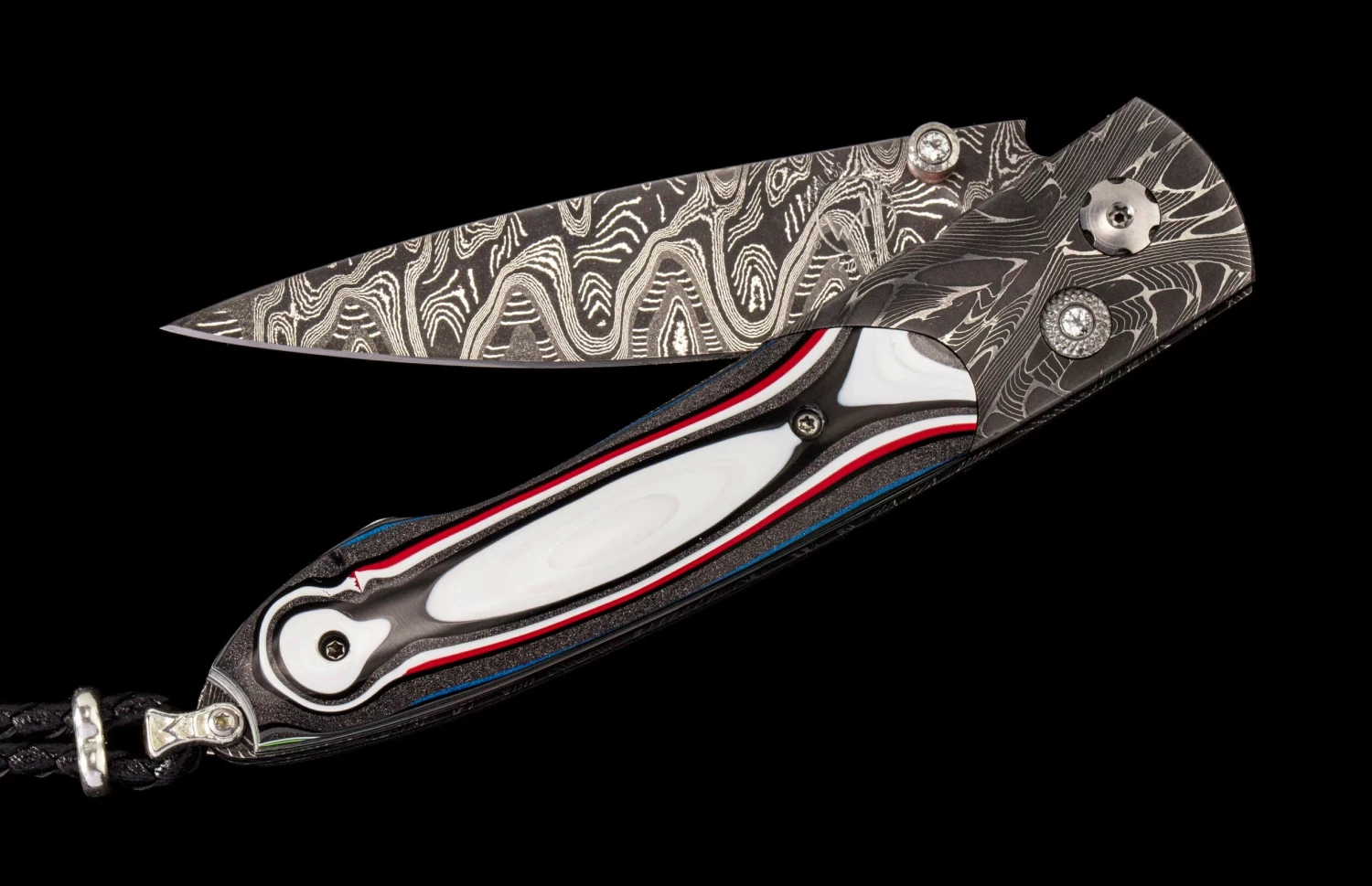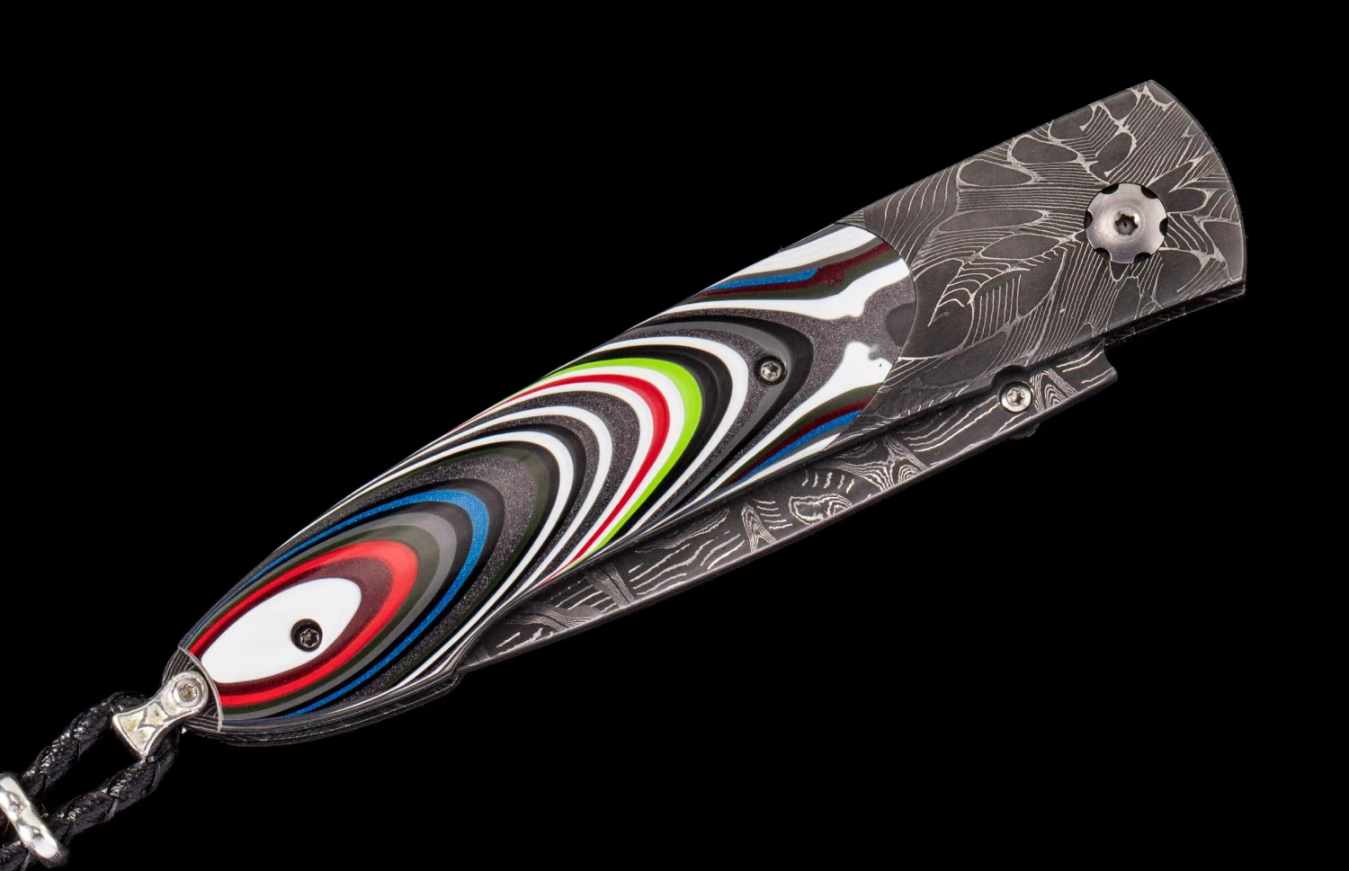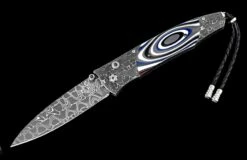The Lancet ‘Throttle’ features a beautiful frame of hand-forged ‘X-Out’ damascus by Chad Nichols, inlaid with Fordite (aka ‘Motor City Agate’). The blade is hand-forged ‘Hornets Nest’ damascus steel by Mike Norris; the one-hand button lock and the thumb stud are set with white topaz gemstones. Sleek, elegant, refined, and comfortable in the hand and to the eye, the Lancet defines the essential gentleman’s folder in the modern world. The ‘Throttle’ features the superlative artistry, the exotic materials and forged metals that are the hallmark of William Henry’s collections; a distinctive personality statement to be worn and used for a lifetime before handing it down to another generation.