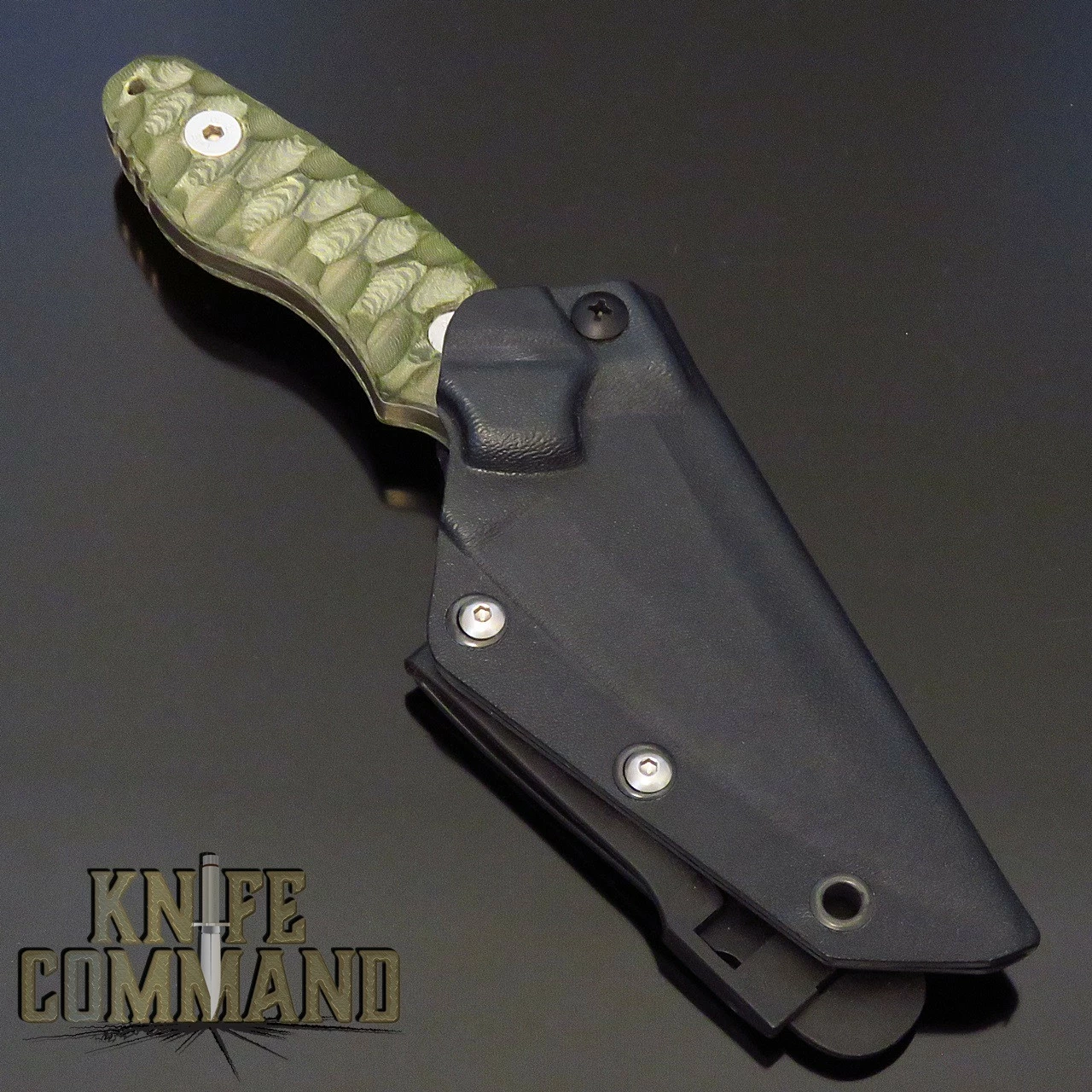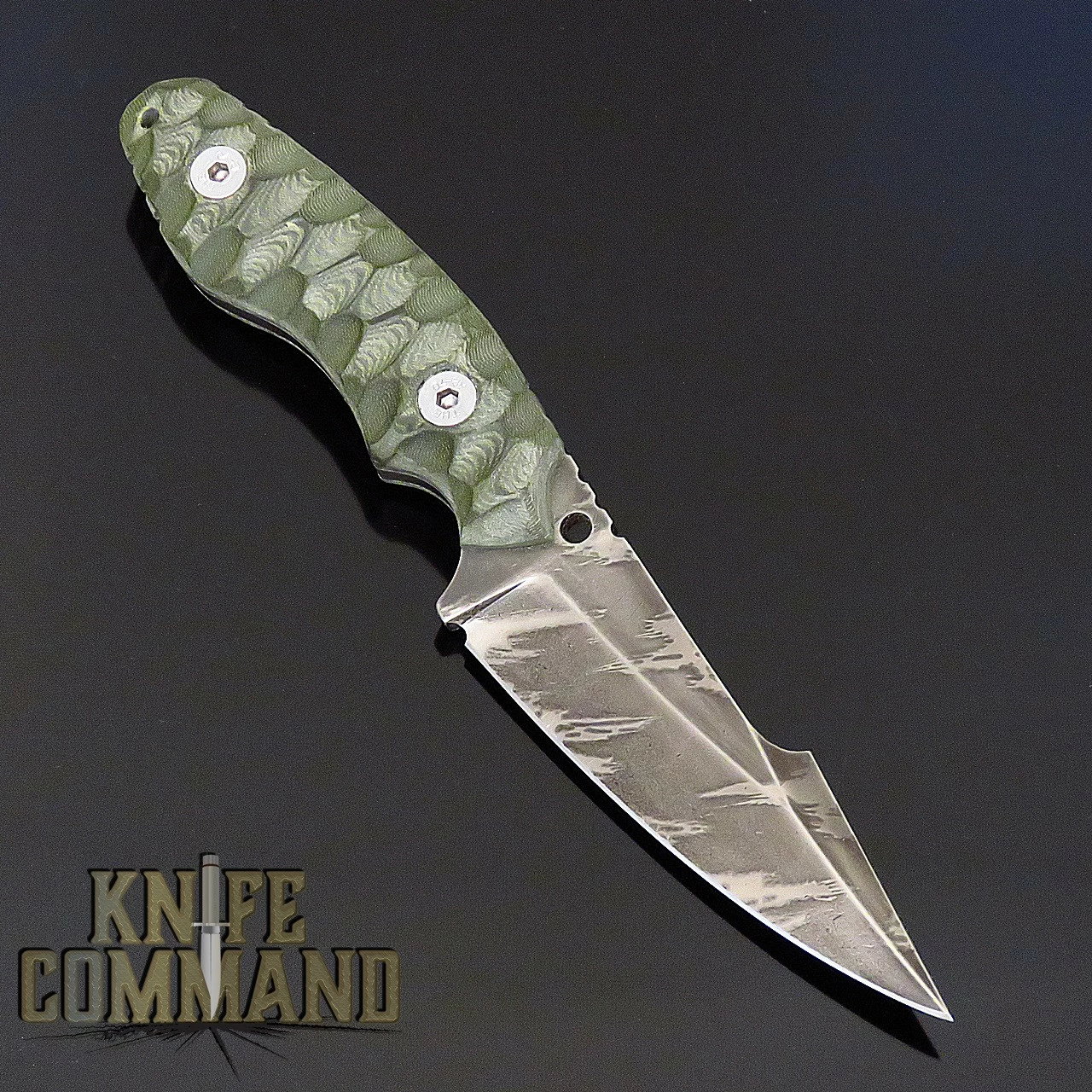 This Wander Tactical Custom Barracuda 8-1/8″ in overall length and weighs 6.7oz. The 3.9” full tang, blade is forged of D2 steel with a Custom Ice Brush GunKote finish. The blade has a complex grind with a fine cutting edge behind a spear-type piercing point. The upper false edge can be sharpened for a super aggressive blade. The Custom Green Canvas Micarta handles are held in place on the 3/16″ thich steel with A2-70 stainless steel bolts. It features two sets of jimping on the handle top and one underneath.