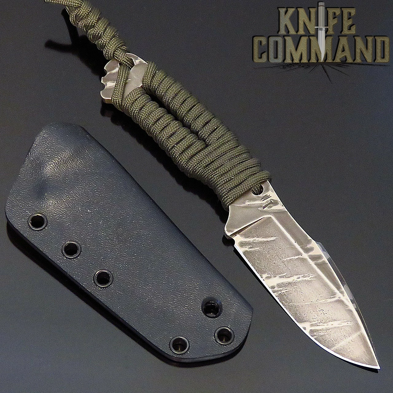 This Wander Tactical Custom Raptor Neck Knife is 7″ in overall length and weighs 4.1oz. The 3.5” full tang, drop-point blade is forged of D2 steel with a Custom Ice Brush GunKote finish. The skeletonized handle has a lanyard hole and jimping on the butt end. This version features Camo Green paracord wrapping. The Raptor comes with a black Kydex sheath.