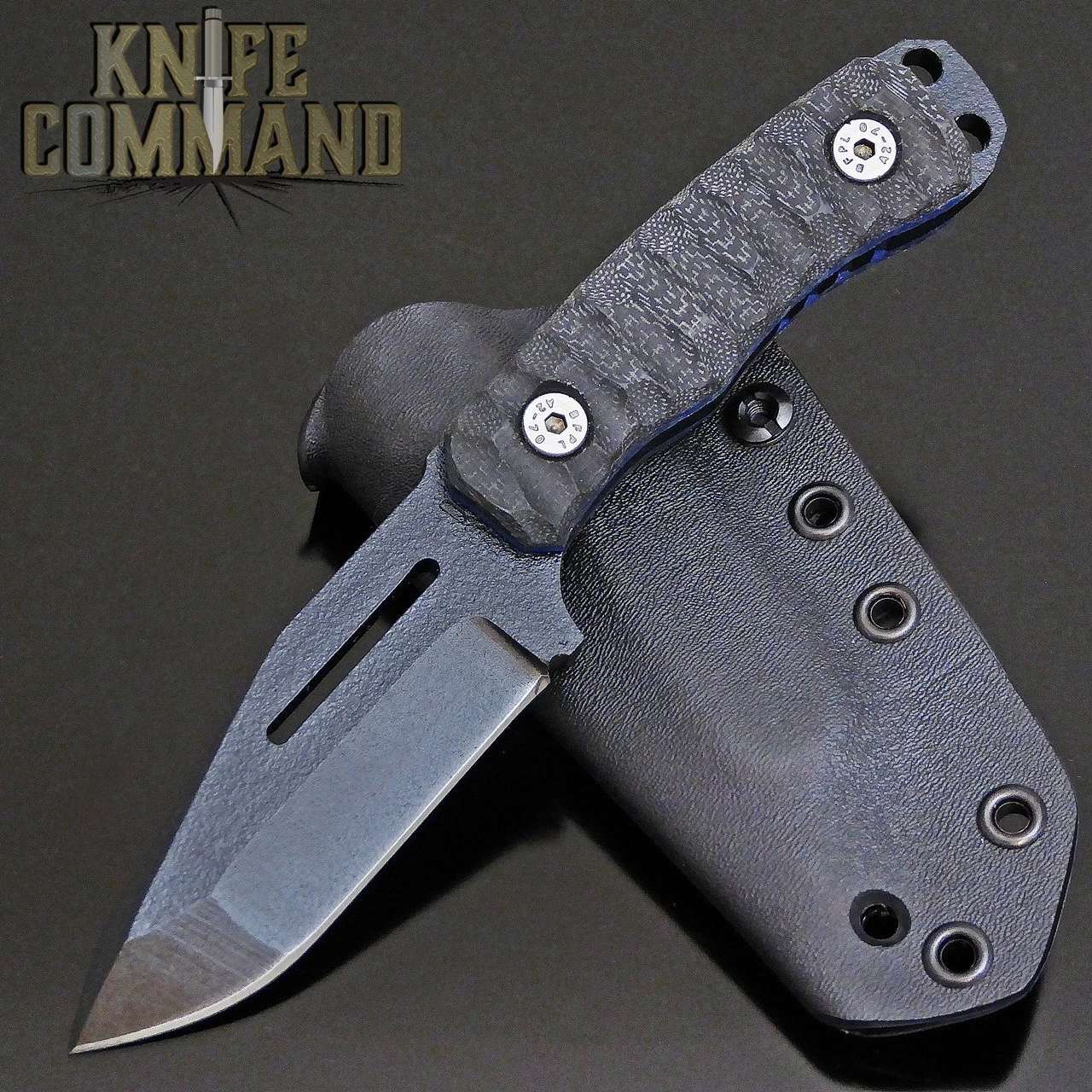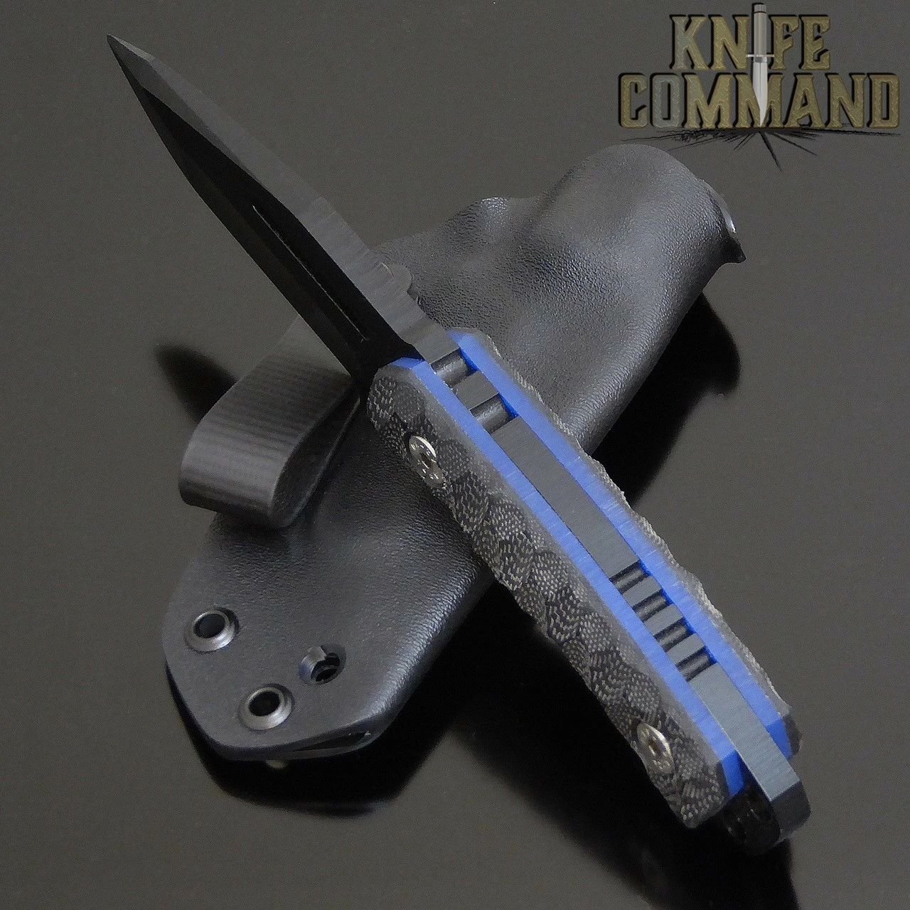The KC Commander is 7-3/4″ in overall length and weighs a hefty 8 oz. The 3-1/4” full tang, drop point blade is forged of D2 steel with a black GunKote finish. The blade has a compound grind with a fine cutting edge behind a reinforced, piercing point. The Black Canvas Micarta handles sit atop Police Blue liners. It features two sets of jimping on the handle top and one underneath. The exposed tang at the butt end is strong enough for smashing and has dual lanyard holes. With the 1/4″ steel, thick liners, and Micarta scales, the KC Commander gives you a handle of almost 7/8″ thickness.