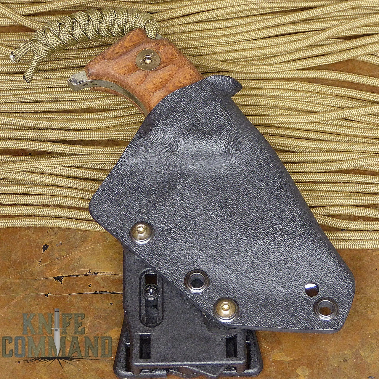 This custom Triceratops is 5.19″ long with a 2.59″ drop-point skinner type blade. This hefty D2 steel blade is .25″ thick, 59-61 HRC, and has a Black Blood Gunkote blade finish. This knife has a 2-finger grip with Cherry Brown Micarta handle scales. It has a lanyard hole with an attached braided desert tan paracord lanyard. For carrying, the Triceratops is supplied with a custom fitted kydex sheath with a Vegaholster belt adapter.