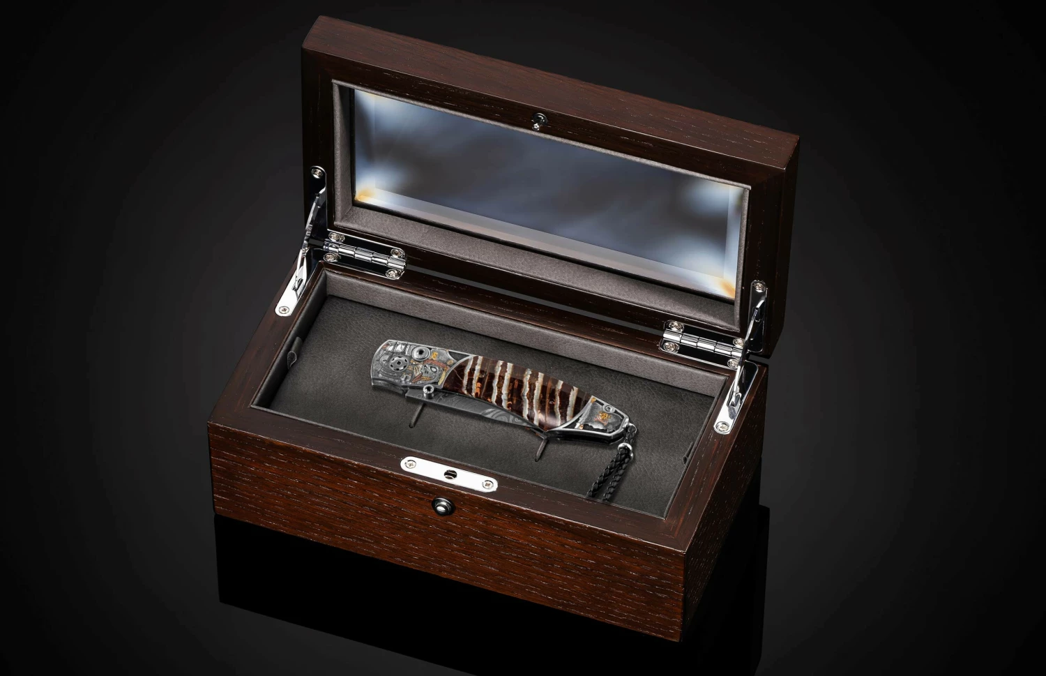 The Spearpoint ‘Wild Pirates’ features a hand-engraved frame with 24K yellow and 14K green gold, and silver and copper inlays by Hannes Glatz, inlaid with a stunning piece of 10,000 year-old fossil Woolly Mammoth tooth. The blade is hand-forged ‘Boomerang’ damascus by Chad Nichols. The one-hand button lock and the thumb stud are set with spinel gemstones.
